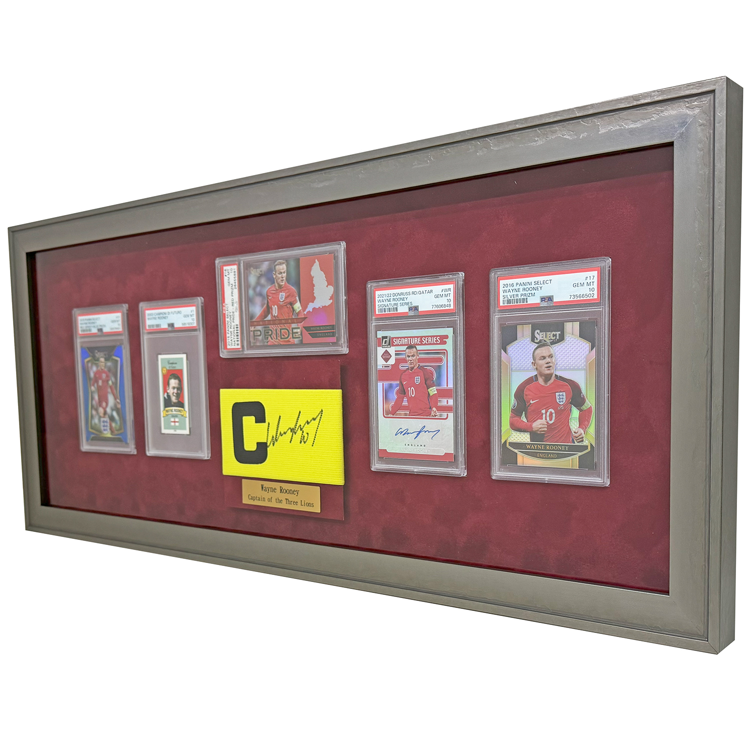 こちらは、そんなウェイン・ルーニーのお宝トレカとキャプテンマークの額装です。5種類のトレカは、PSA鑑定済のケースのまま額縁にセットしました。マットへの埋め込み+背面テープ留めで、少しばかり前にせり出させているのがポイント。キャプテンマークは背景と同色の土台を用意し、トレカとは高低差を付けて飾りました。キャプテンマークの下、ゴールドの彫刻プレートも華を添えています。