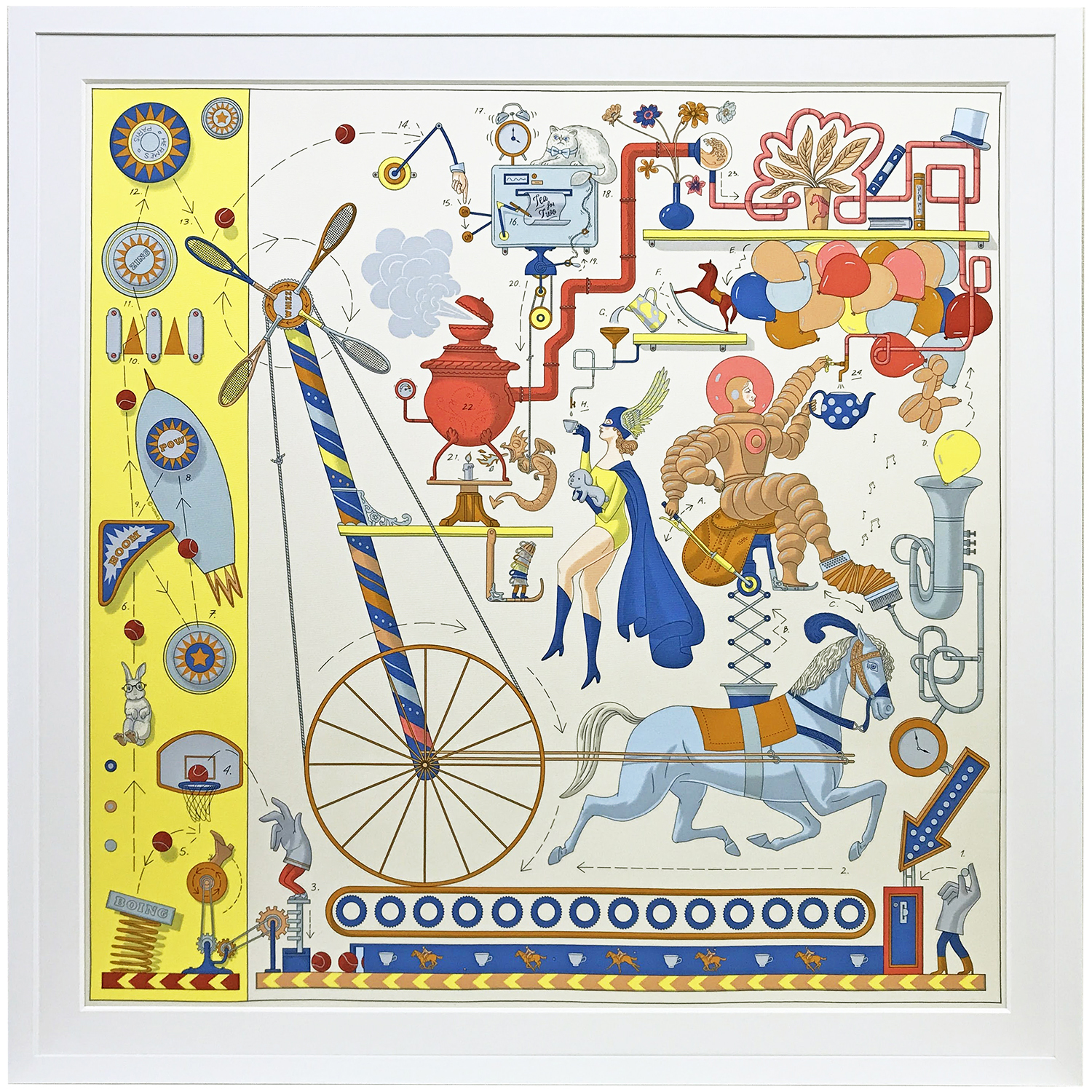 エルメスの90cmスカーフ「ティー・フォー・トゥー」をマット付きで額装しました。中央に描かれている、女性の持つティーカップに注目するとそこにはスカーフのデザイン全体に渡る複雑な過程が。飲み物が注がれる道のりをついつい追ってしまう遊び心溢れるデザインです。
