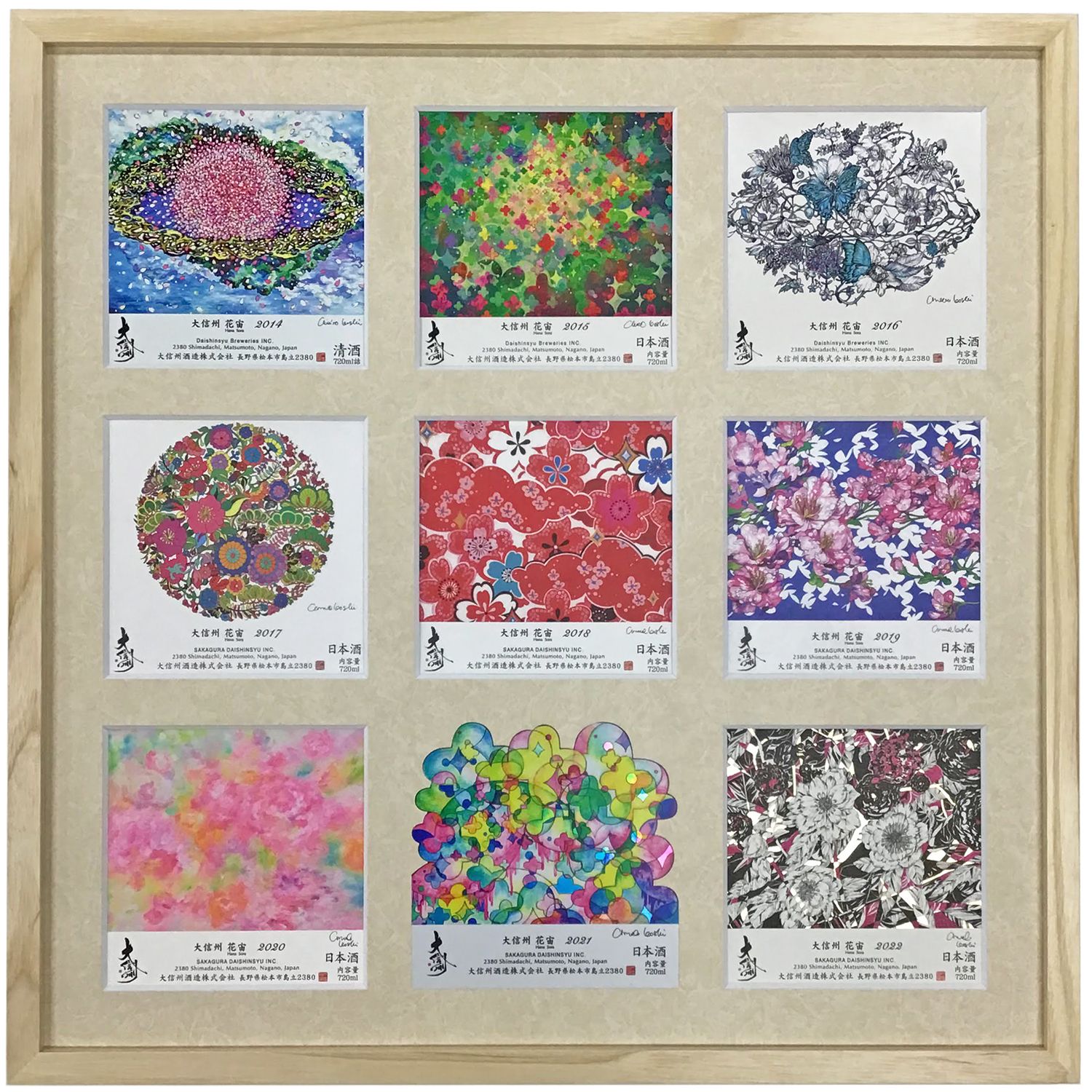 自然な木製額と温かみのあるマット色がほぼ同色で纏まっており、華やかで色とりどりなラベルの個性を落ち着いて眺めることができる額装になりました。