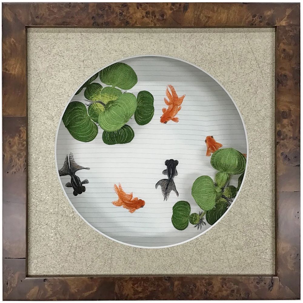 プールなどで水を覗き込むと光の屈折のせいで水底が浅く見えるのですが、刺しゅうの作り出す情景があまりにもリアルなので本当にマット越しに水中を覗き込んでいるような心地になります。BOX額が、見た目より奥行きのある涼し気な金魚鉢か水槽になったようで…。写真でしかご覧いただけないのがもったいないほどでした。