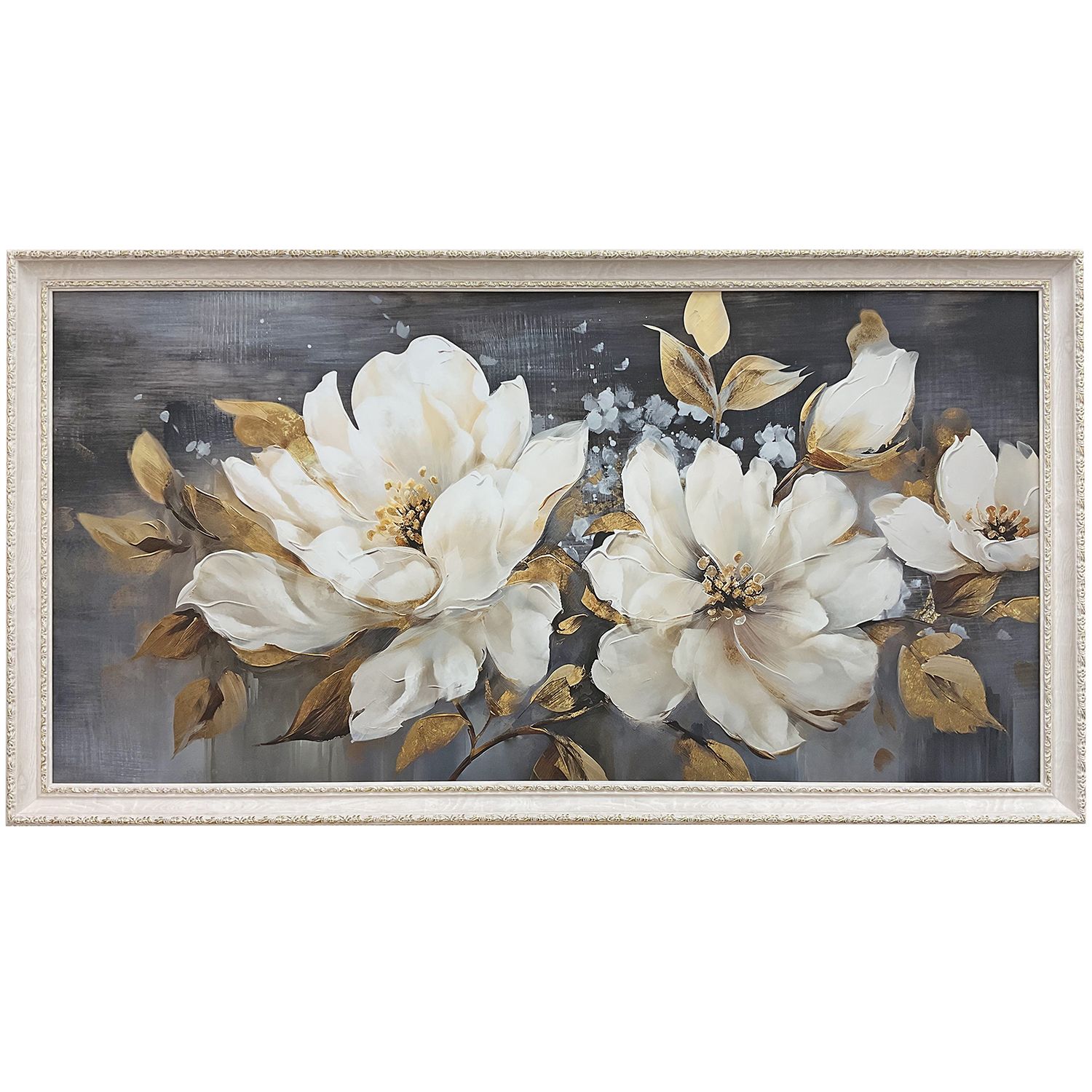 美しい白い花が印象的な布ポスター。お客様のお部屋のインテリアが白を基調としているとの事でしたので、白のフレームで統一感が出るように。また葉っぱのゴールドに合わせて、フレームにもさり気なくゴールドが入っている