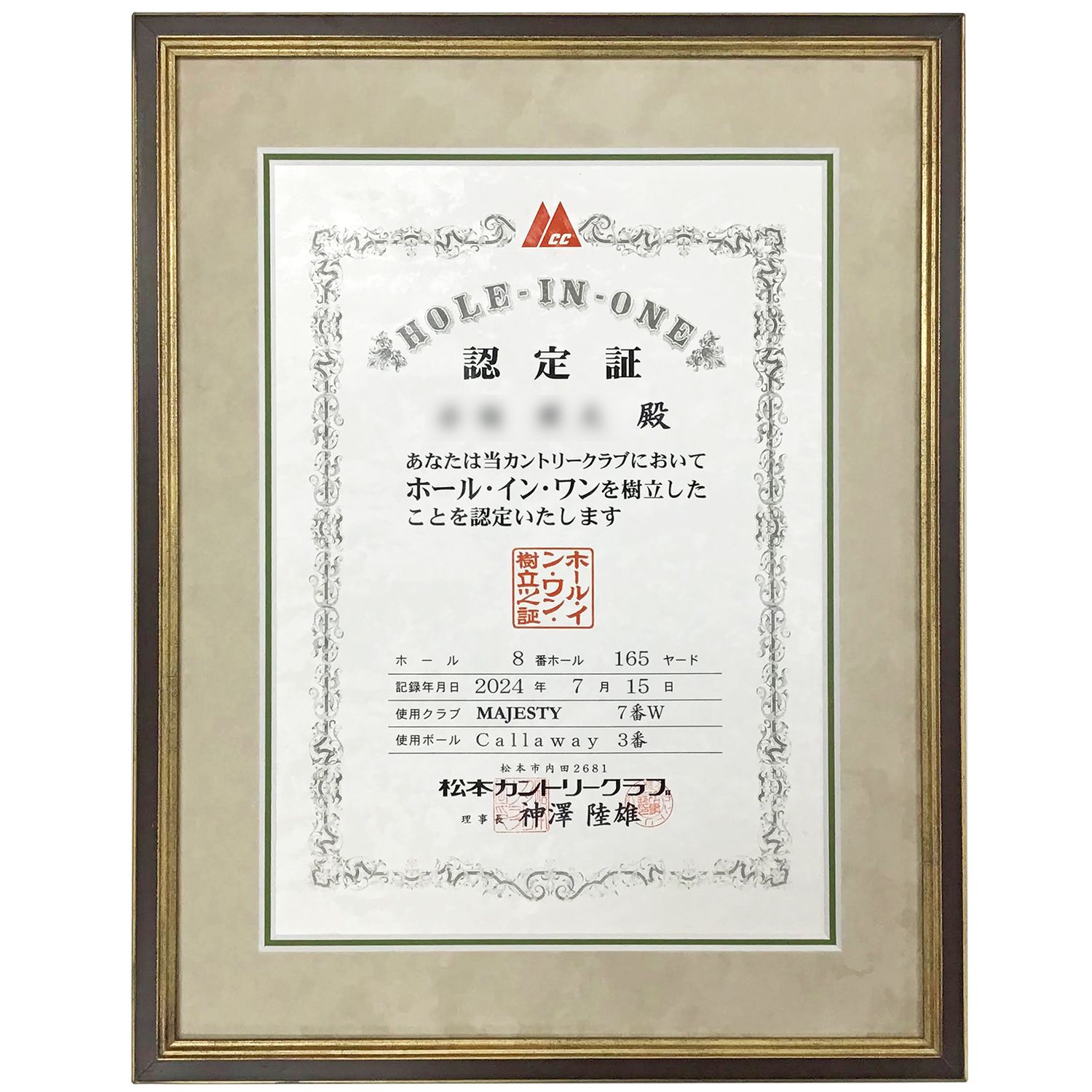 ゴルフでホールインワンを達成された際の認定証を額装しました。