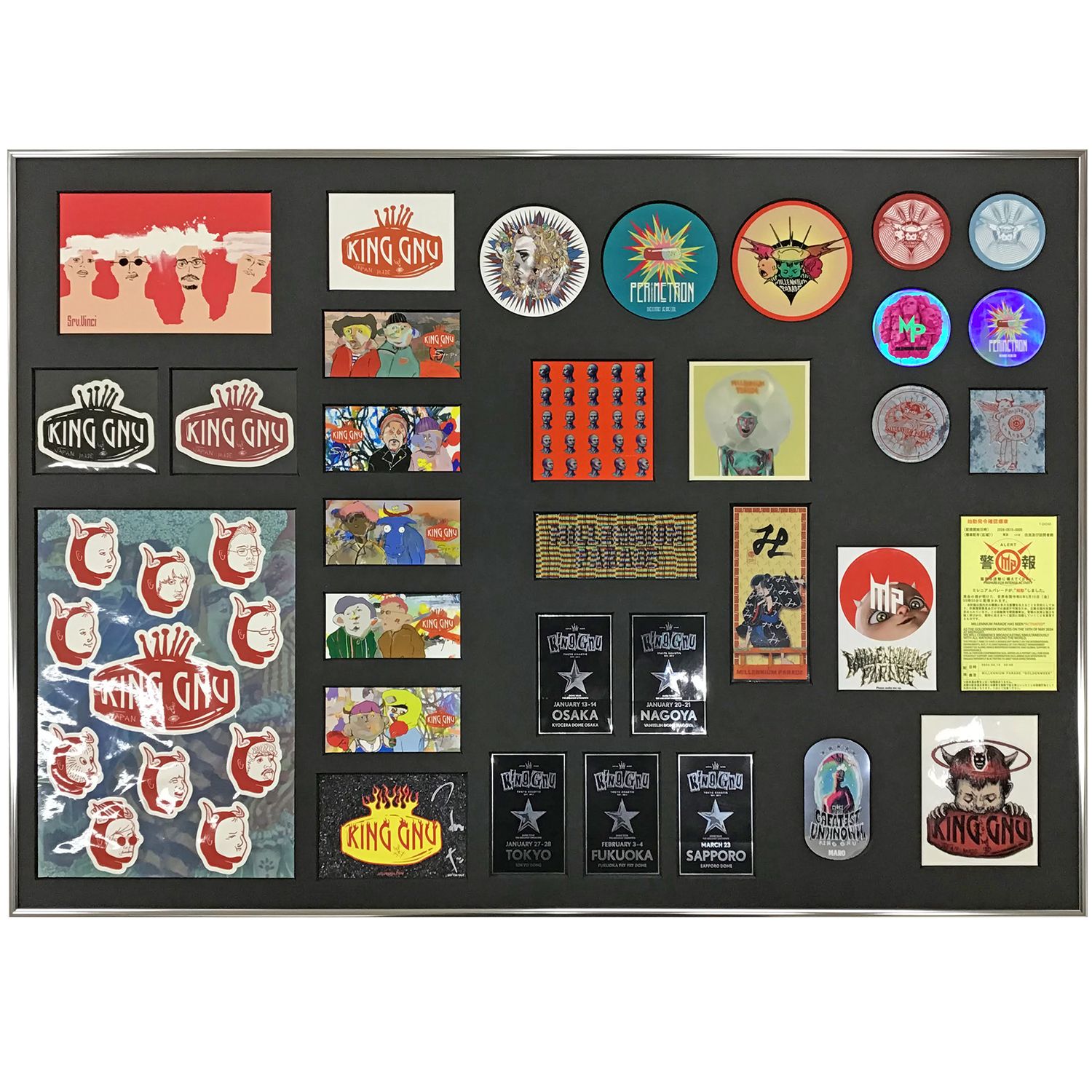 king gnuのロックバンドステッカーを額装しました。 お客様のご要望に合わせて、ステッカーの配置を一つ一つ確認しながらバランス良く並べたので、ひとつのアートとしてまとまりのある仕上がりとなっています。この作品に込められたお客様のこだわりと愛情が感じられる額装です。