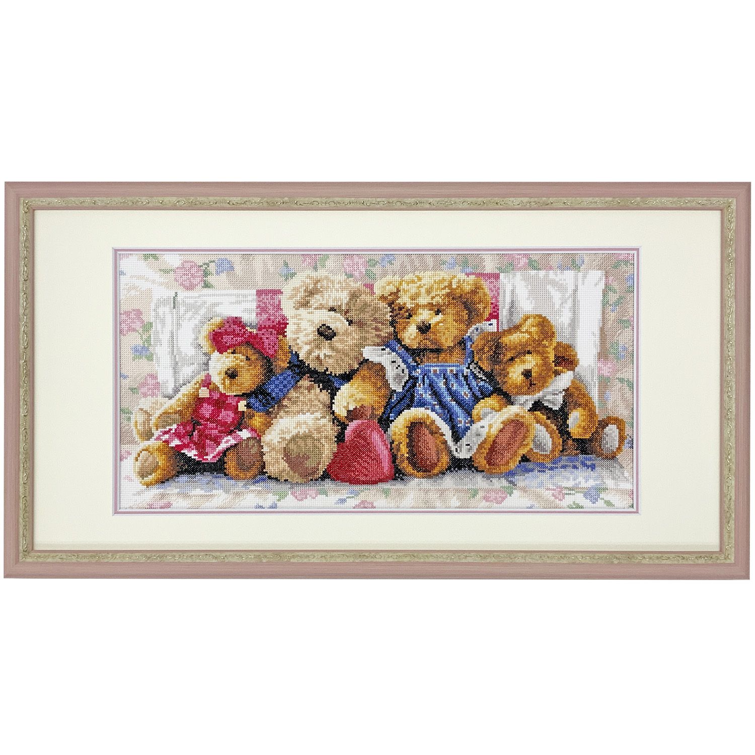 テディベア達が4匹並んで座っている様子に思わず「可愛い!」と口に出してしまいそうな可愛らしいデザインのクロスステッチを額装しました。それぞれのクマたちの様子を見てみると着ているお洋服やリボン、毛色や顔つきも一匹一匹に個性があります。よくみると中央には赤いハートが転がっていたりして、全体的に温かみのある雰囲気が漂っています。
