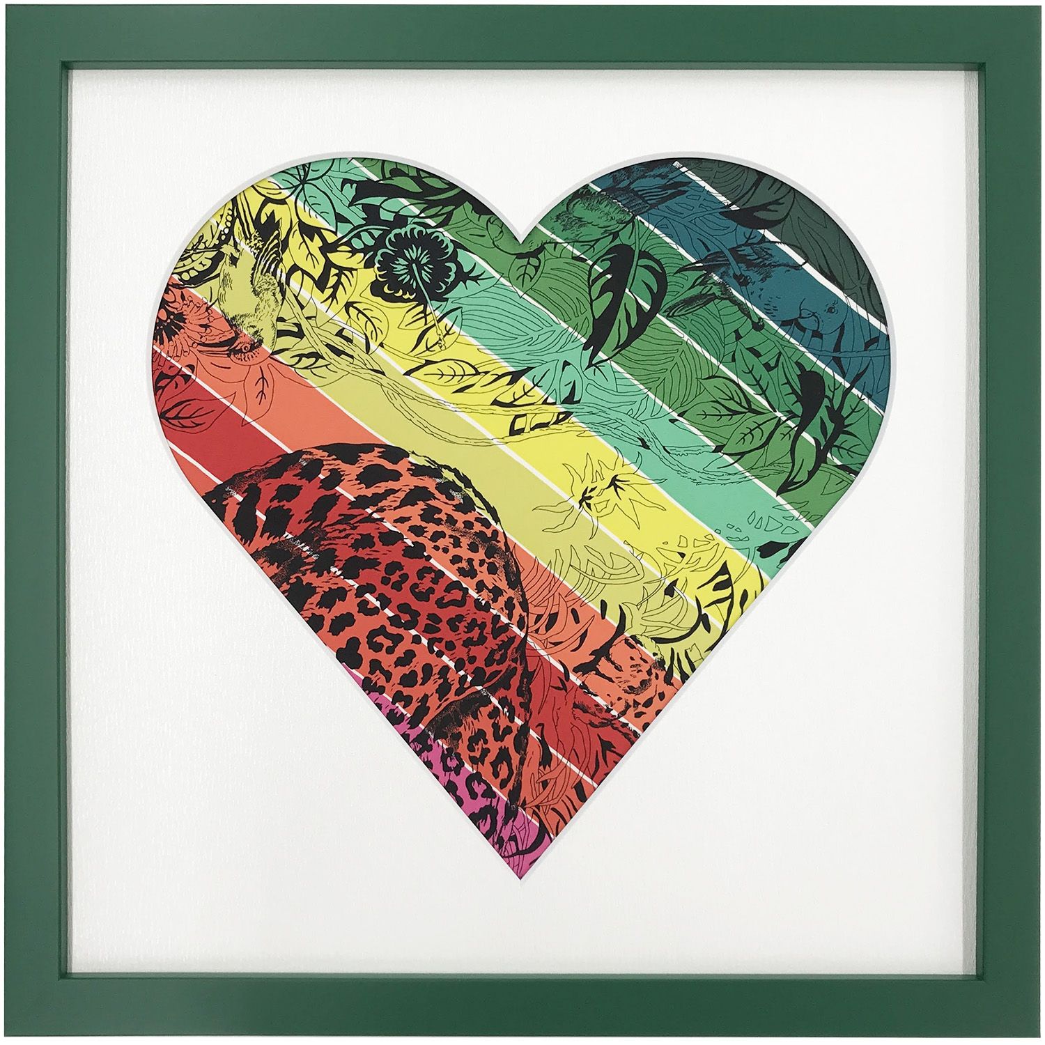 エルメスの「ジャングル・ラブ」の一部分のデザインを、ハート型に仕上げたスカーフをマット付きで額装しました。スカーフの形に合わせてマットもハート型にくり貫いています。
