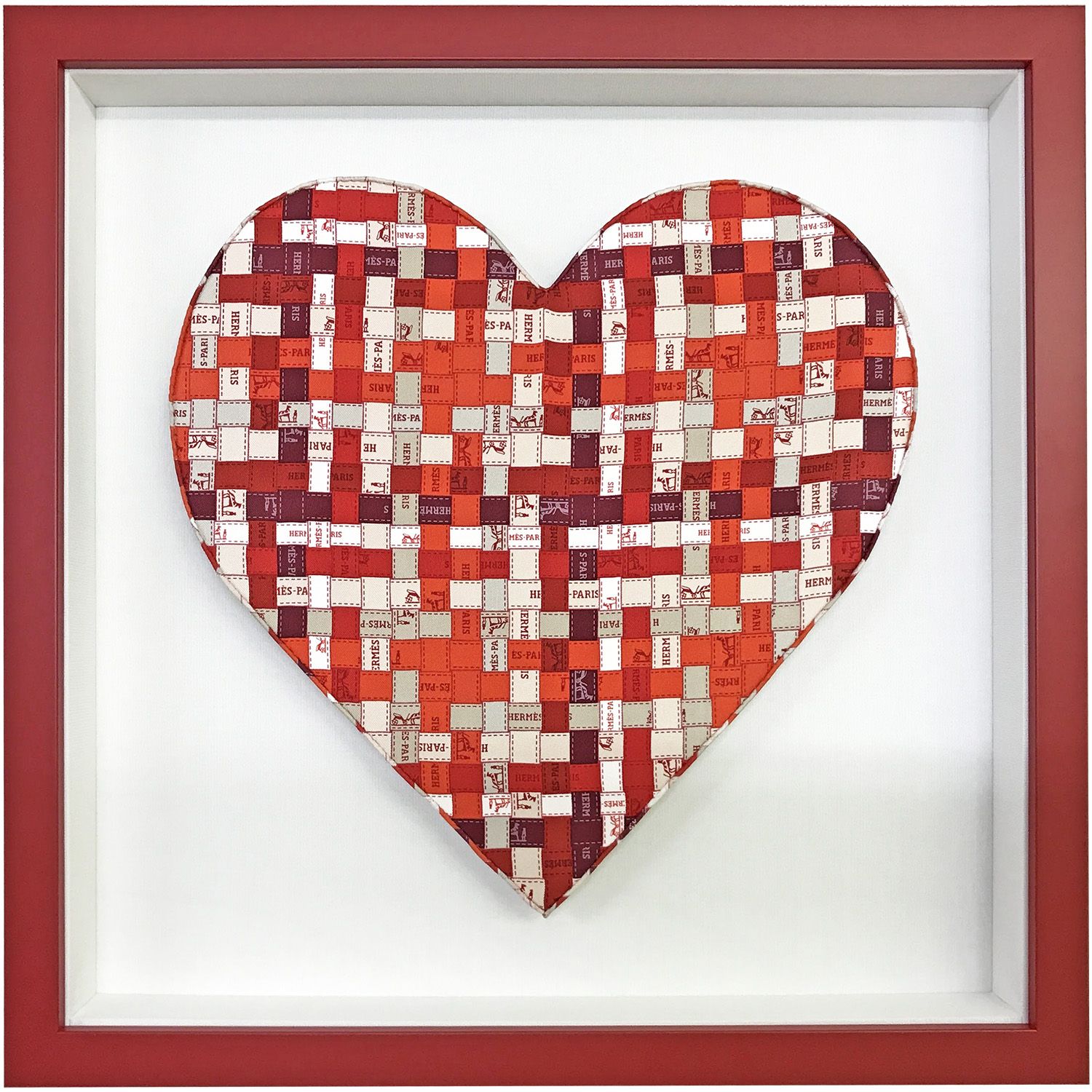 エルメスのハート型のカレナノ「ボルデュックチェック」を浮かし額装にしました。立体感のある仕上げでスカーフの魅力をそのまま見せられます。