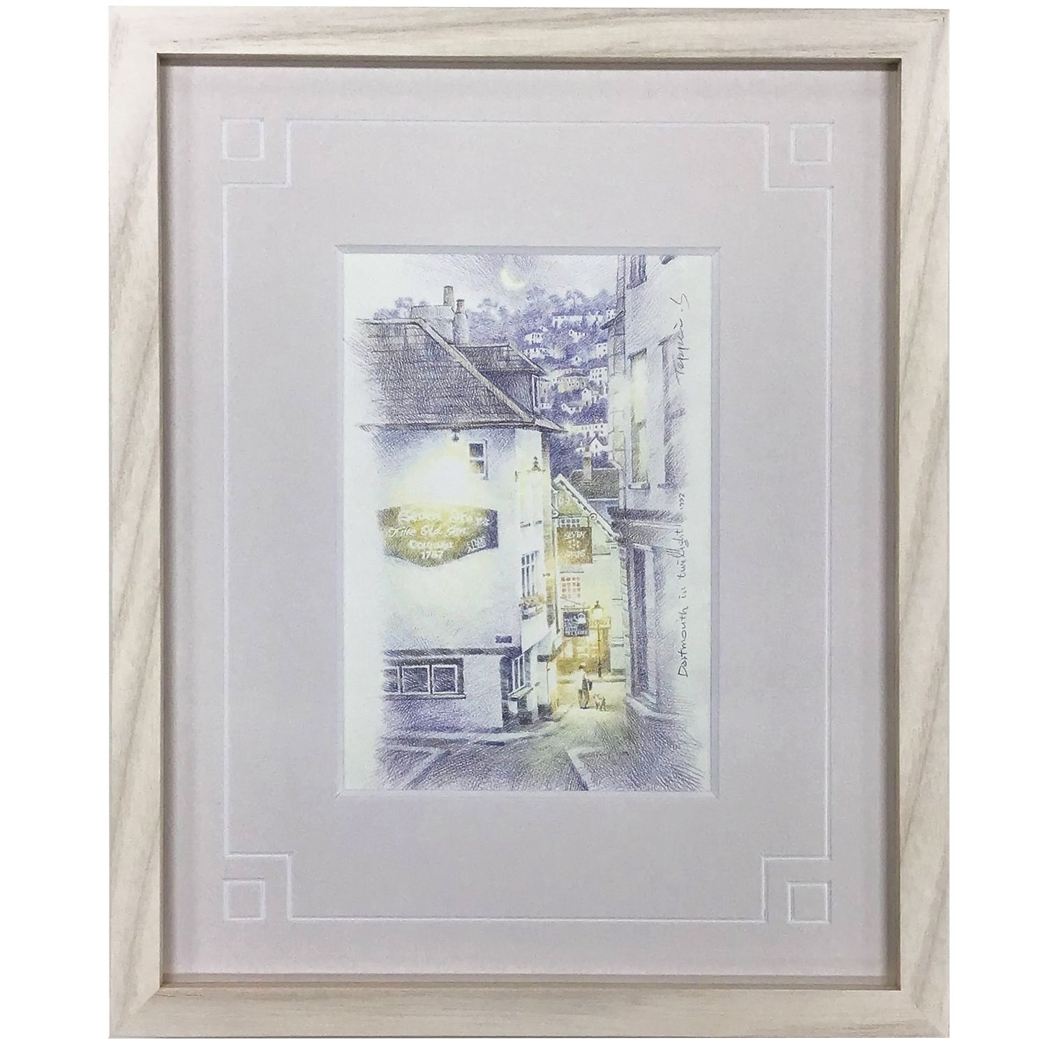 笹倉鉄平の作品は、どれも光の表現が非常に巧みで、心が安らぐ情景を描いた作品が多く、見る人の気持ちを浄化してくれるような美しさがあります。水彩画の風景を描いた作品のドラマチックさも素晴らしいのですが、今回額装したのは、ふんわりとしたオシャレな街角が淡い色鉛筆で描かれている、愛らしい複製ポストカードです。