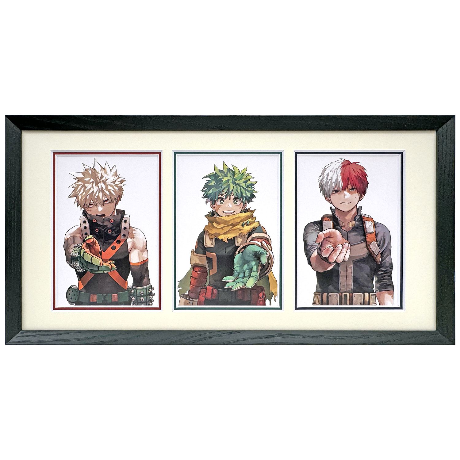 最終巻発売時に特典として緑谷出久、爆豪勝己、轟焦凍の3人のポストカードが付属されました。この絵柄は当日の新聞広告でも使用された絵柄で、手を差し伸べるオリジン3人組の尊さが詰まっています。そんな堀越先生の画力が爆発したポストカードを1つの額縁に収めました。マットに窓抜き加工が3つされておりますが、