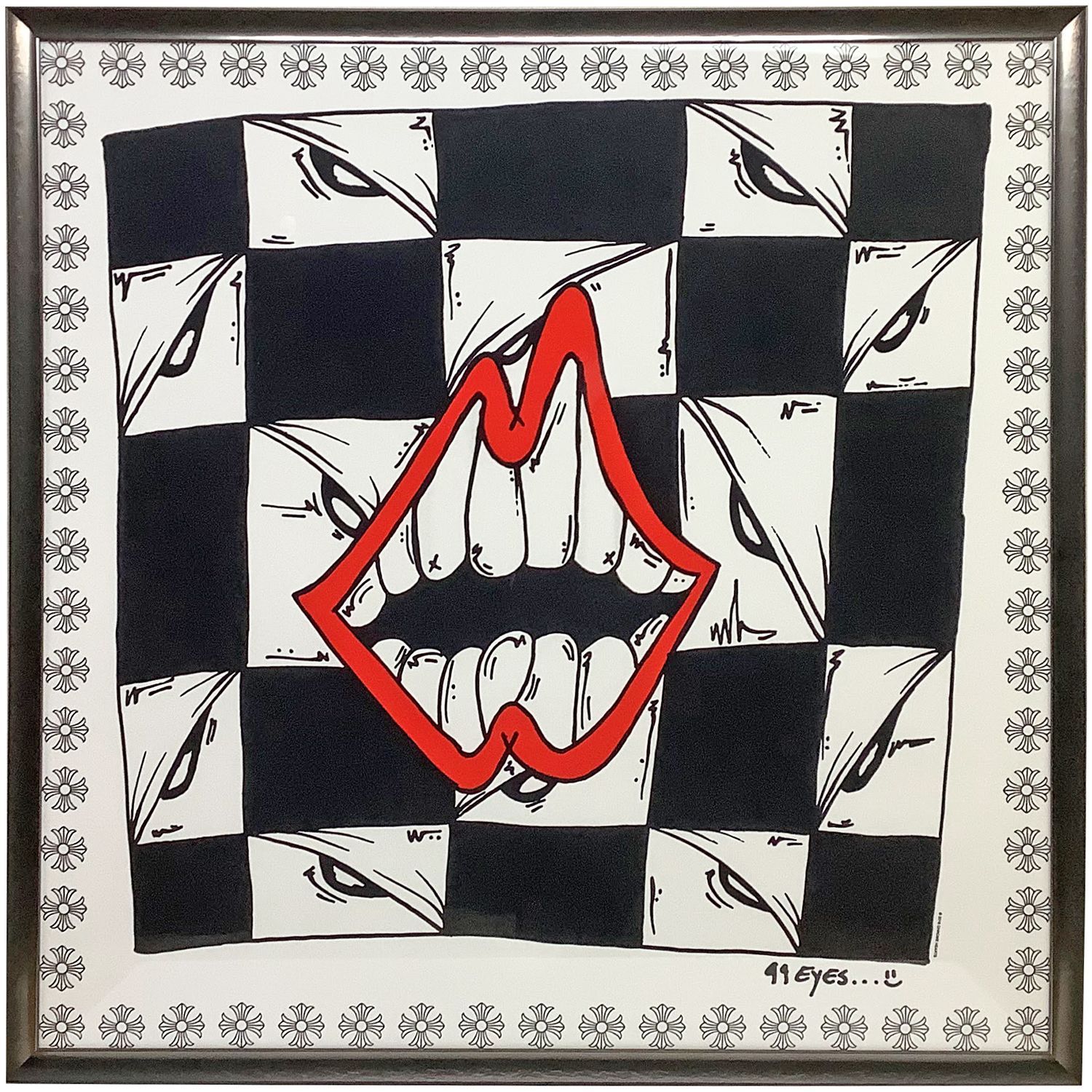 クロムハーツと世界的に有名なアートデザイナーMatty Boy(マッティボーイ)とのコラボアイテムの一つであるスカーフを額装しました。クロムハーツの特徴的なチョンパーモチーフが目を惹くアイコニックなデザインとなっています。