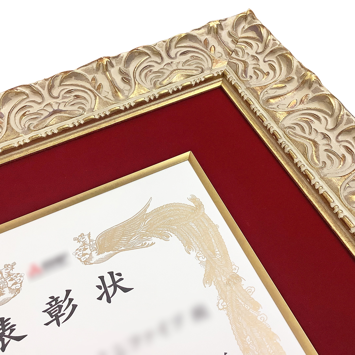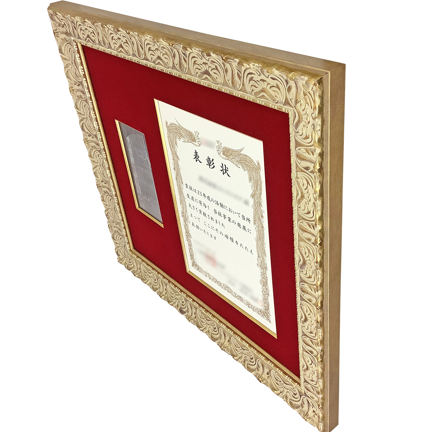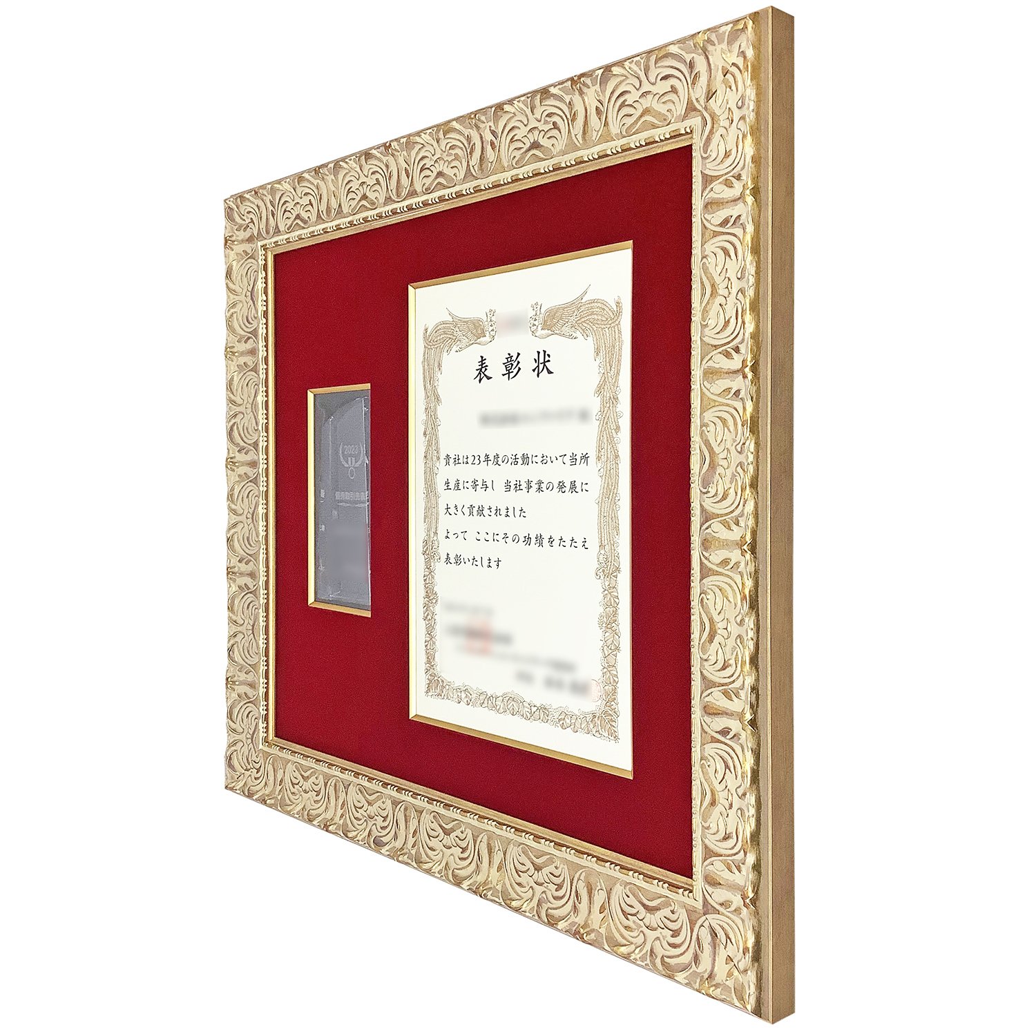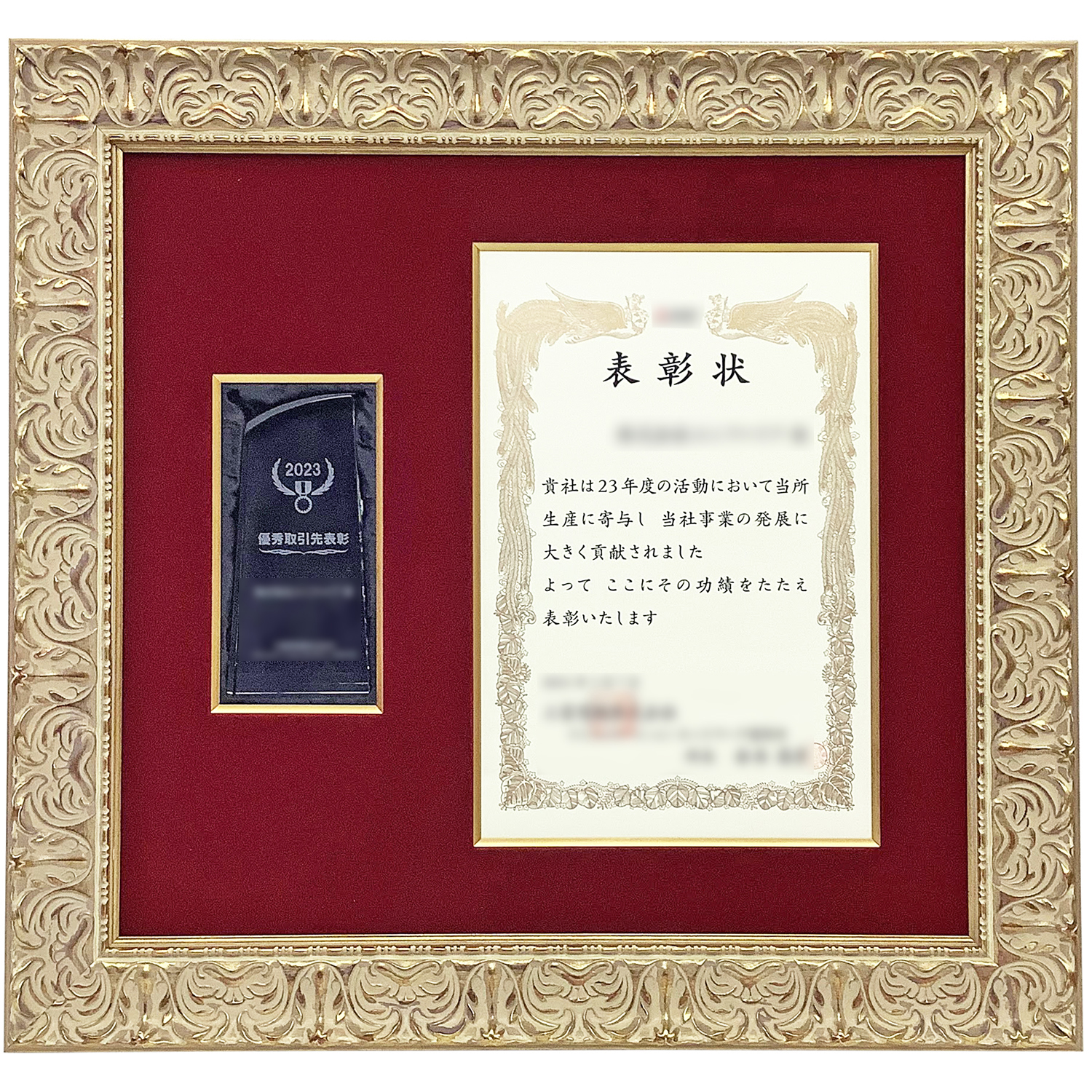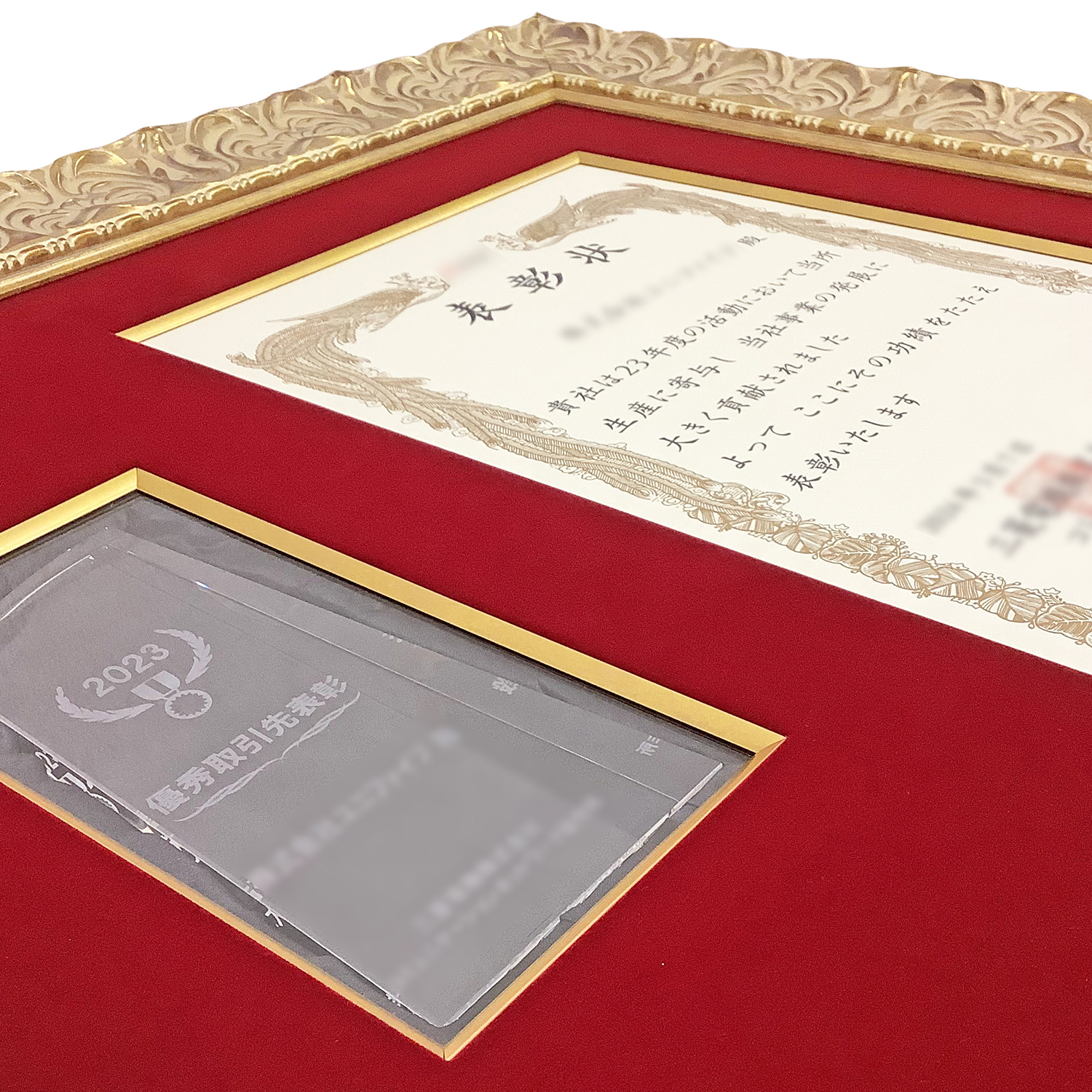 使用したフレームは大柄な彫り模様が施された型物、燻し仕上げによって模様の陰影が際立ちます。暖色が強めのゴールド色が、表彰状の格式とトロフィーの透明感を引き立て、全体に温かみと重厚感を与えています。