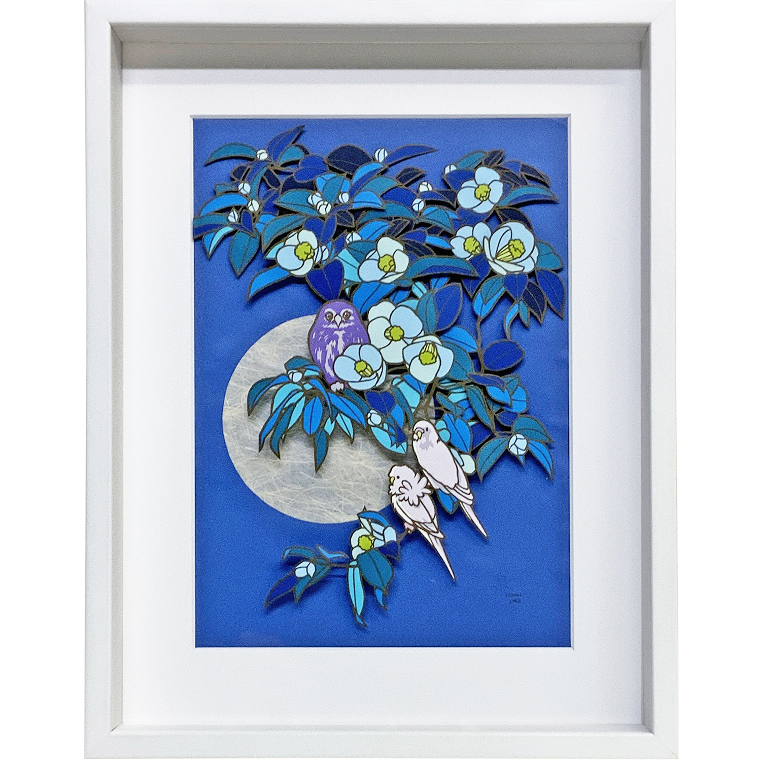 夜の静けさを感じる、椿やフクロウ、インコがあしらわれた重ね切り絵の額装です。切り絵が立体的に重ね合わせられており、シャドーボックスとはまた違った立体感があります。木々の枝の重なりや、葉の陰に紛れるフクロウの様子が見事に表現されています。