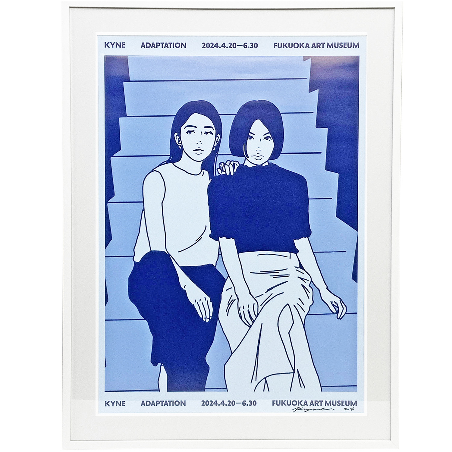「ADAPTATION - KYNE」のキービジュアルポスターの額装です。2024年の4月20日から6月30日まで福岡市美術館にて開催された、KYNE(キネ)の国内初となる大規模個展「ADAPTATION」。現代的なクールな女性を描くKYNEは、国内外で多くの人から人気を得ています。