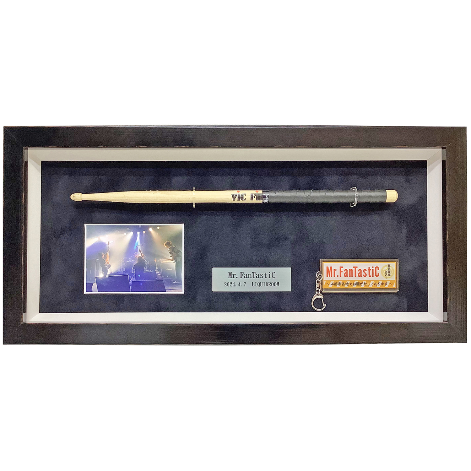 ライブ会場でMr.FanTastiCのメンバーから直接いただいたお品物。ドラムスティックとキーホルダー、そしてステージの熱気を感じる写真を組み合わせた額装です。ファンとしての特別な思い出を形に残す額装になりました。