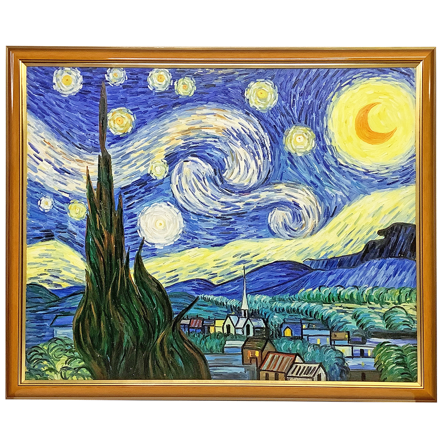 星月夜(The Starry Night)の額装です。星が輝く夜の別名でも呼ばれる、ゴッホの代表作の一つ。夜の静けさ、ワクワク感、星の輝きの美しさ、夜に対する様々な感情が全て内包されているような傑作です。見る人によっては不気味にも、希望に満ちた美しい風景にも見える、多層的な魅力があります。
