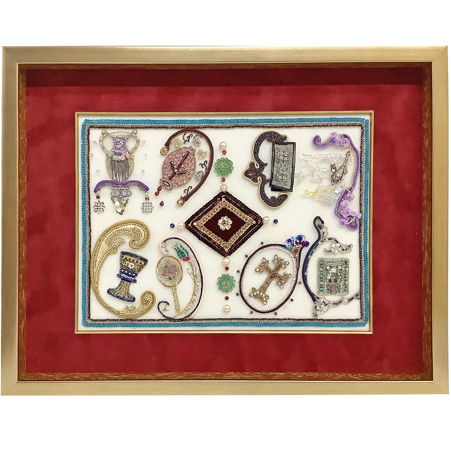 「スエード赤24605」「面金ウッドゴールド」の組み合わせになります。深さのある立体額と組み合わせることで奥行きが生まれるのに加え、ビーズ自体に厚みのあるため、刺繡部分と表面カバーのアクリルの接触を防ぐというメリットもあります。フレームのゴールドと面金のウッドゴールドの組み合わせが連続するラインアクセントのようになって美しい仕上がりとなりました。