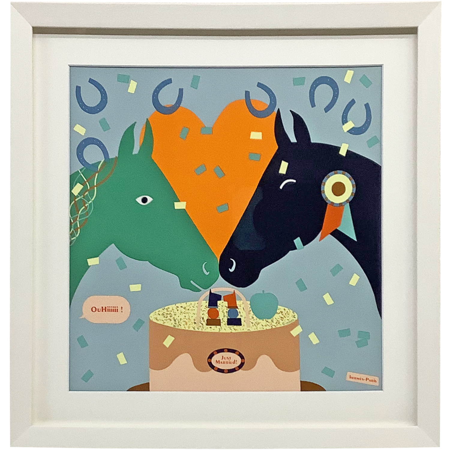 エルメスのガヴロッシュ 45 「ジャスト・マリッド」を深型仕様で額装しました。向かい合う二頭の馬とハート模様が可愛らしい絵柄です。二人の下にあるのはウェディングケーキでしょうか。「ジャスト・マリッド(結婚しました)」の文字が描かれています。スカーフは額装をしてしっかりとインテリア風に仕立てれば、結婚式のボードにもぴったりな仕上がりになります。