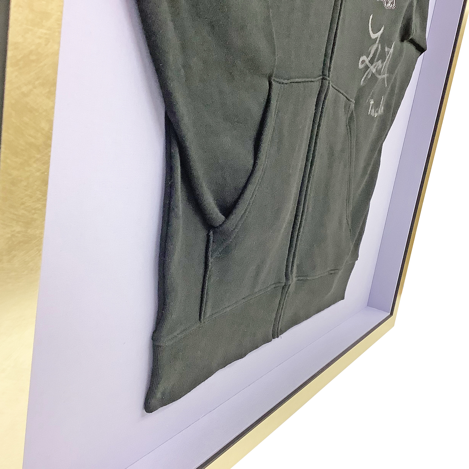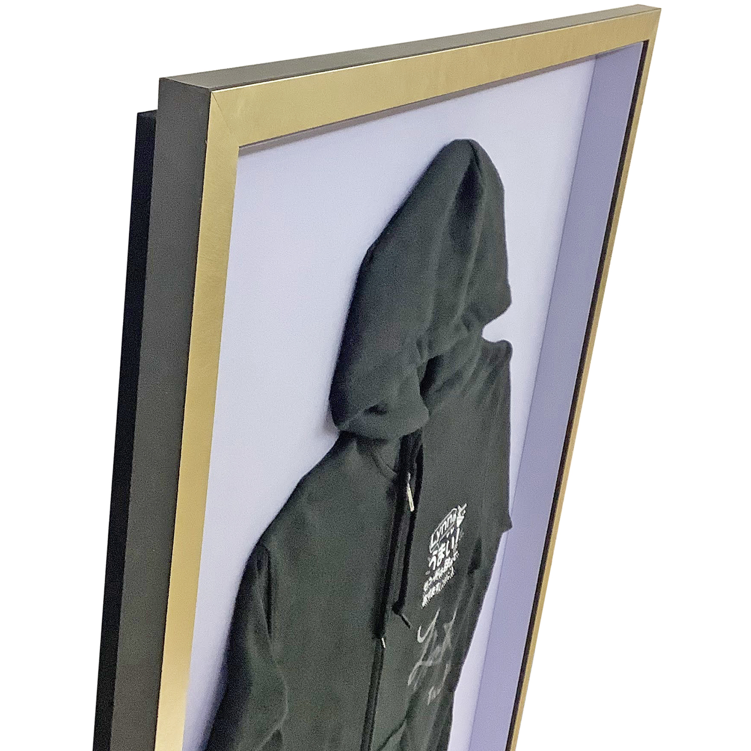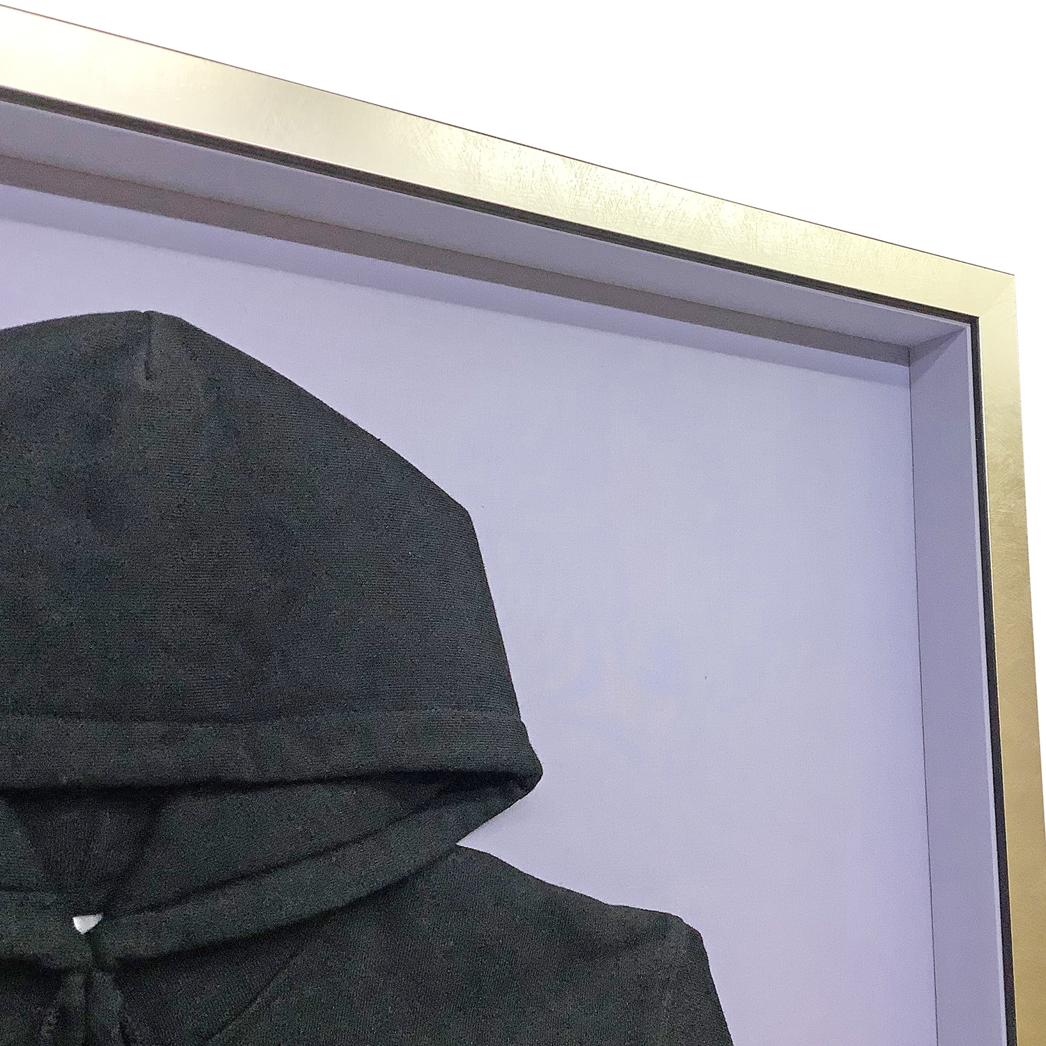 フレームには、額縁のタカハシコレクションから「MDF2800 ゴールド」を採用。華やかなゴールドの輝きが、黒のパーカーと背面の淡い藤色の布地を上品に引き立て、洗練されたインテリアへと昇華させています。