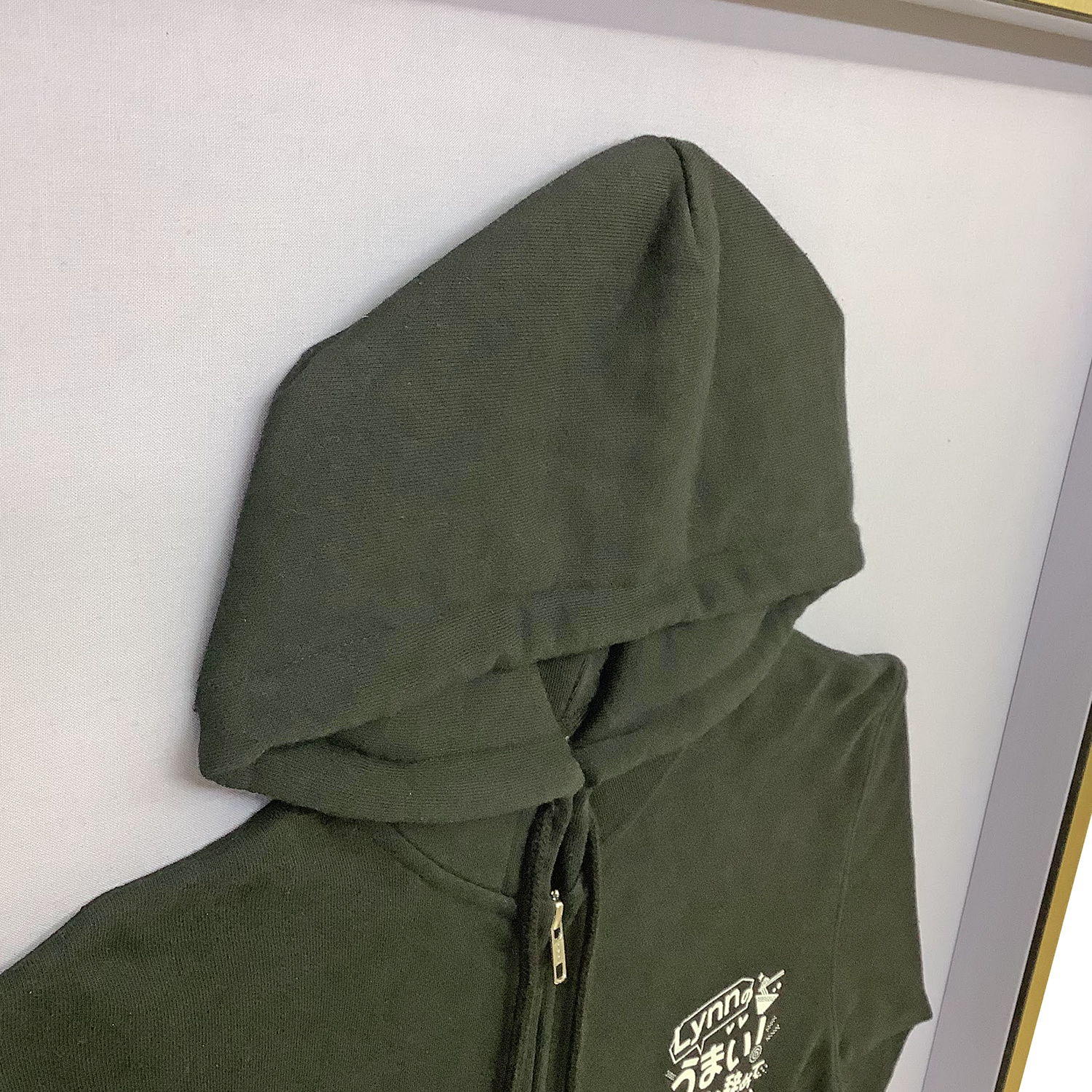 パーカーのように厚みのある衣類を飾る場合は、生地を潰さないように内部の深さに十分な余裕のある額縁を選ぶことが重要です。まずは