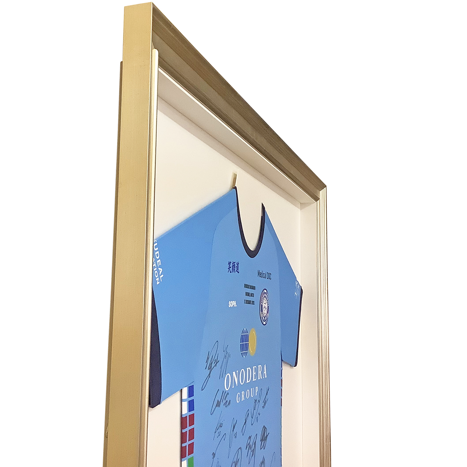 選定した額縁は、重厚でクラシックな形状が魅力の大作向けフレーム。壁から一段立ち上がる奥行きのあるデザインが、展示品にスポットライトを当てたような立体感を演出し、空間の中で自然に注目を集めます。気品あるシルバーフレームの輝きが、鮮やかなブルーのユニフォームをよりいっそう格調高く引き立てています。