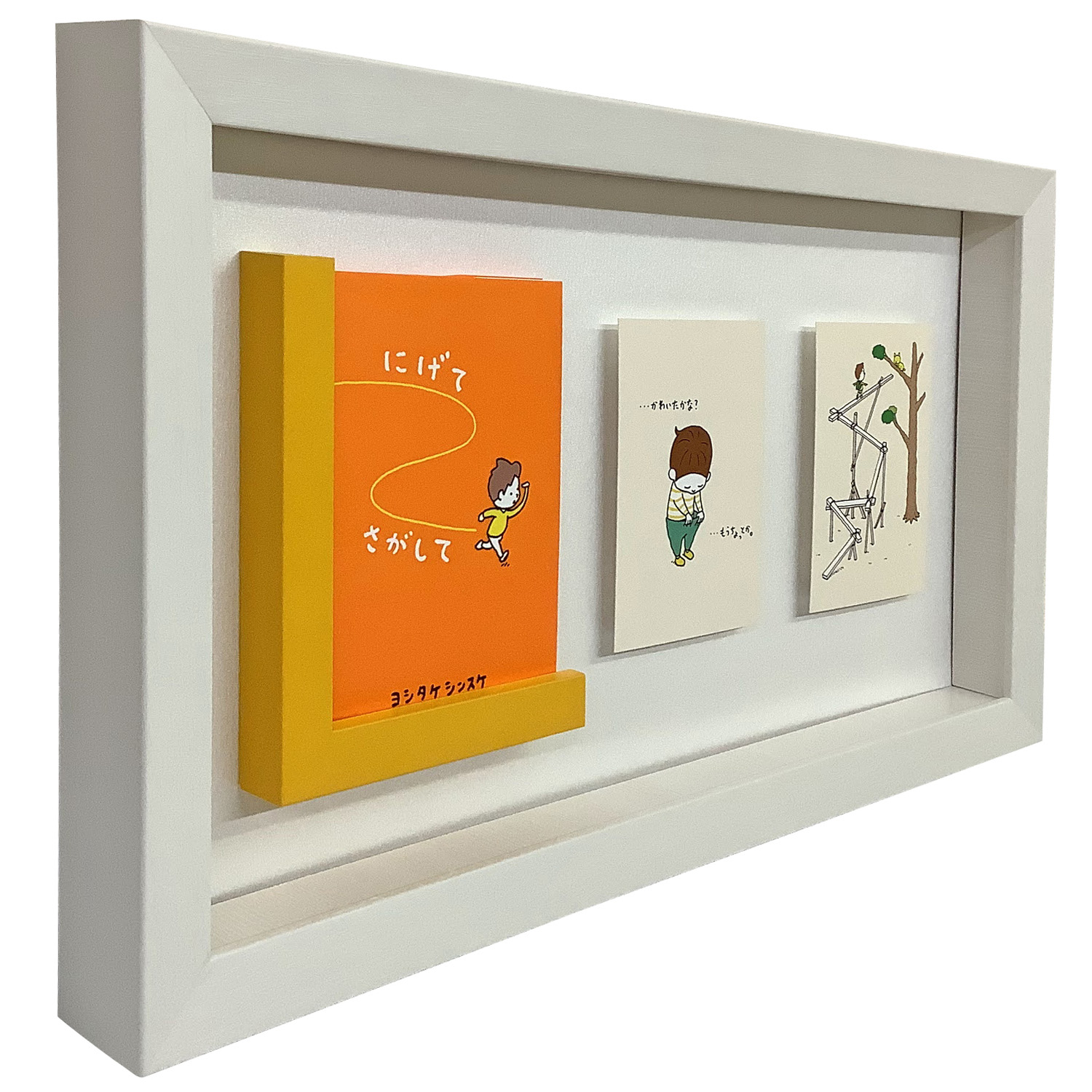 スタッフの言葉通り、ヨシタケシンスケさんの愛らしいイラストと、独特な間合いの物語に魅了されている人は多いはず! 線一つとっても、形の愛らしさに目が行き、いつまでも眺めてしまいます。絵本とポストカードを組み合わせ、作品世界の魅力とユーモアがストレートに伝わる額装をしてみました。
