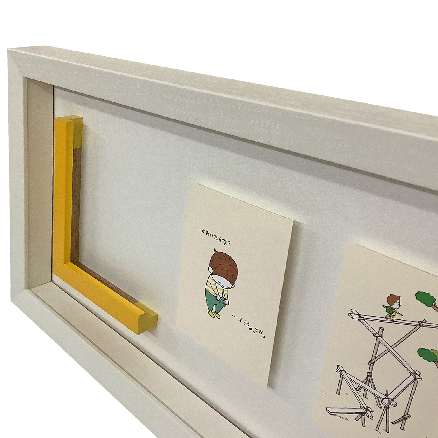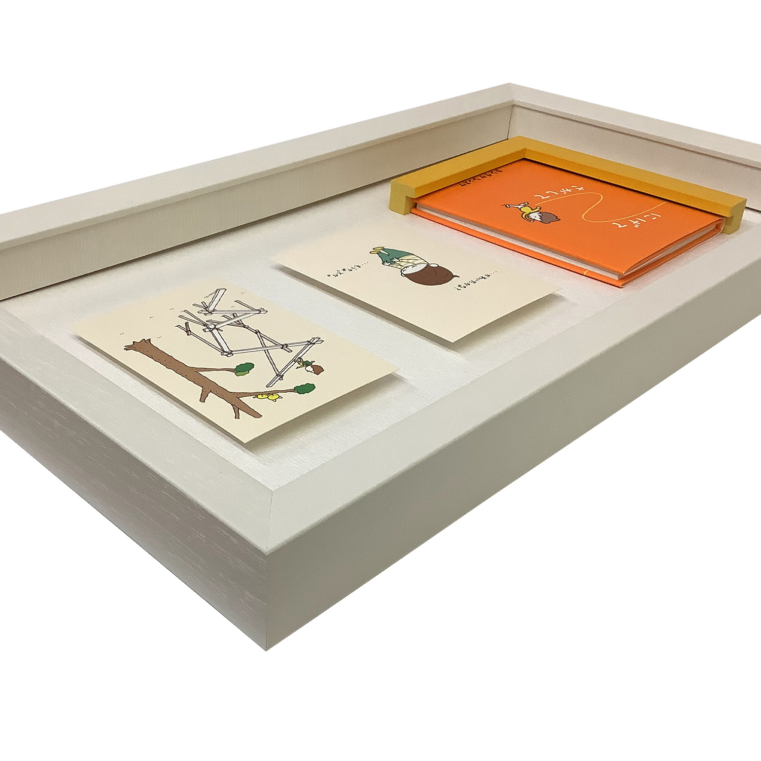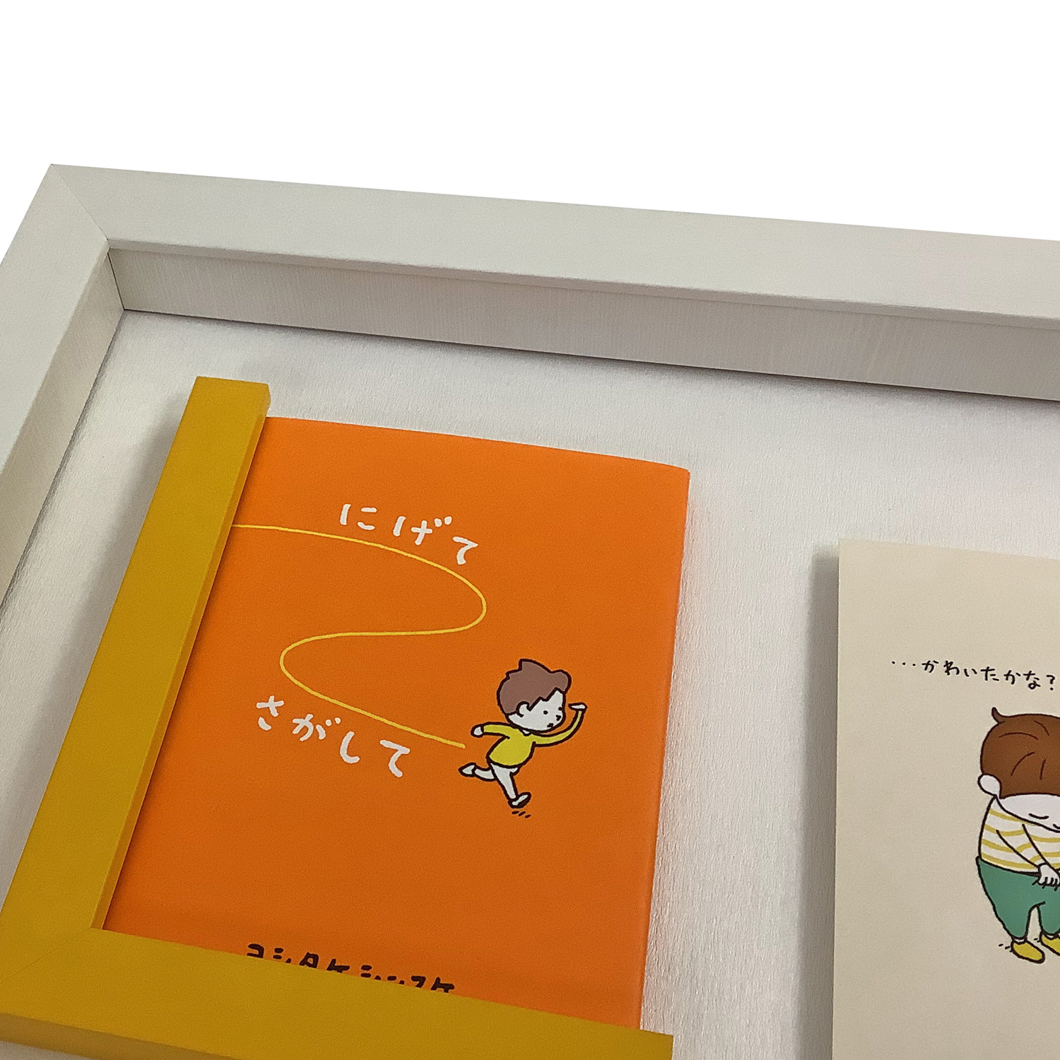 奥行きのあるBOX内にハガキなどを他のグッズと一緒にセットすることで、複数窓等で飾る時とはまた違った一体感が生まれました。絵本を飾る部分はL字型の本棚をフレーム部材で製作。本を手前に倒れづらくし、額を開けたときも取り出しやすいようになっています。ポストカードは二枚とも浮かし額装になっています。しっかり留めるのも落下防止になりますが、自分自身で加減し弱粘着シール等で留めて飾り替えも可能です。