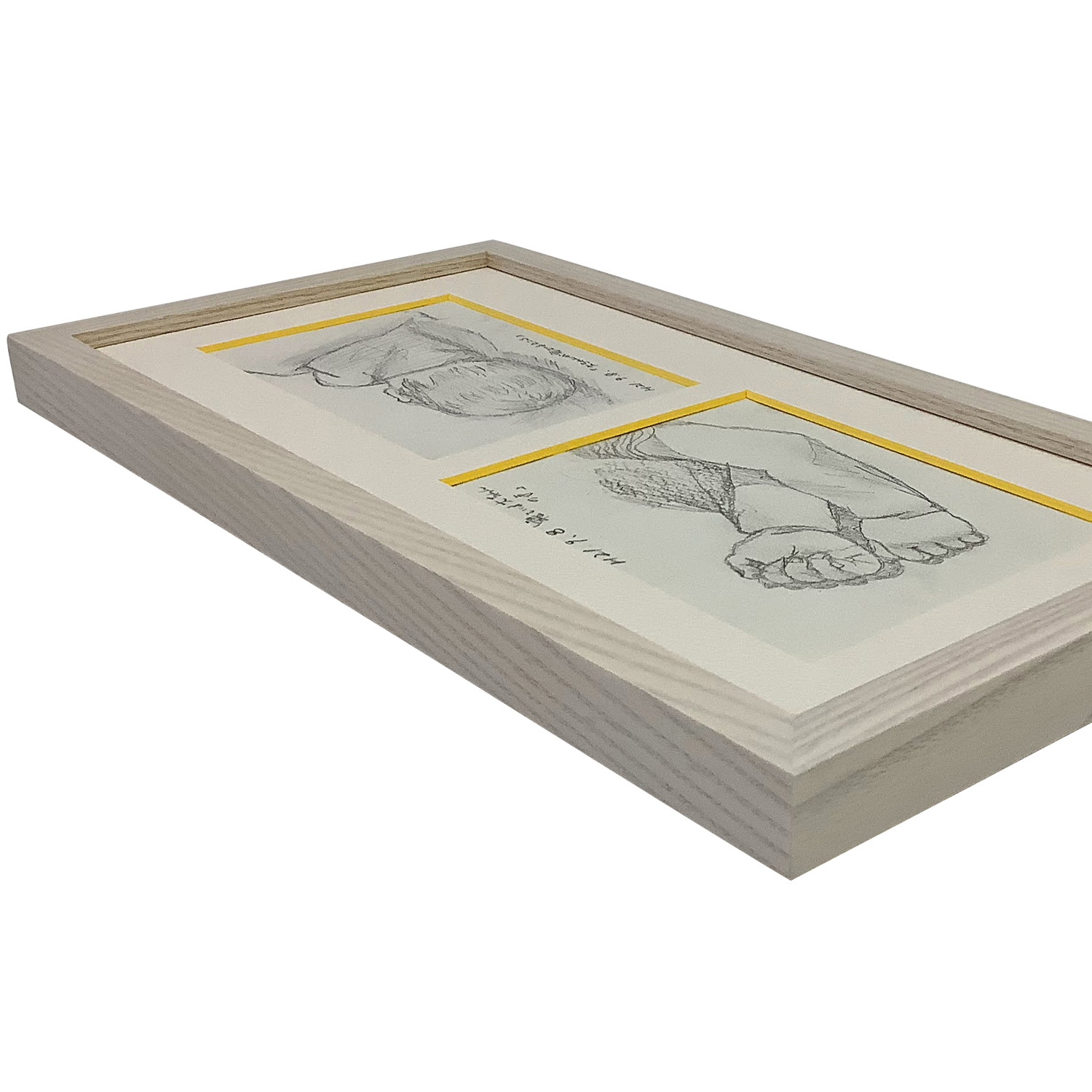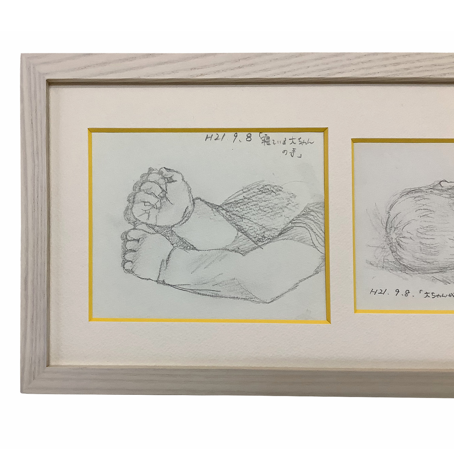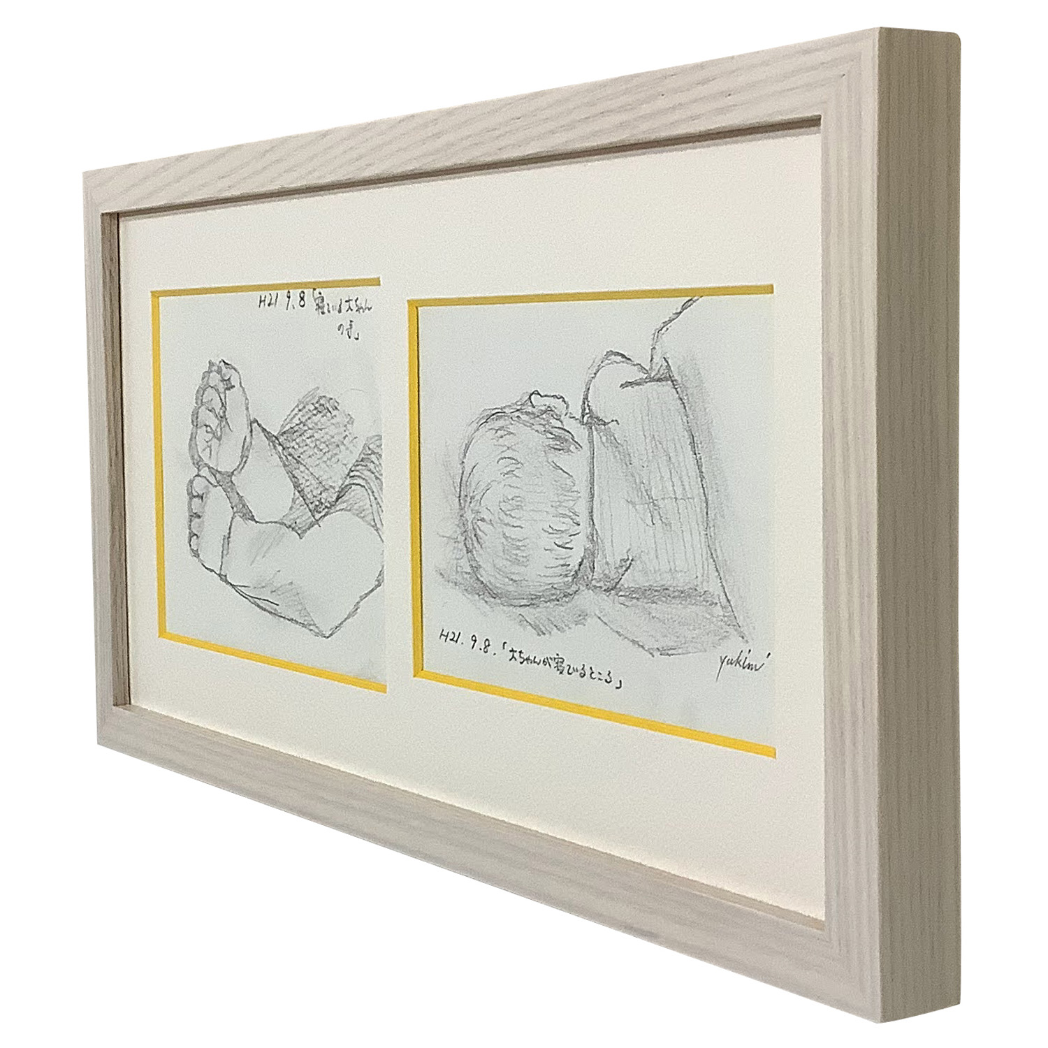 当店スタッフによる手描き作品、お子さんがまだ赤ちゃんの頃に寝姿を描いた、愛情あふれる鉛筆画です。2枚のスケッチをひとつの額縁に収めるため、マットに窓を2つあける「複数窓抜き加工」を施しています。マットには切り口が黄色い「カラーコア黄」を選びました。額縁は、木製の温かみが心地よい既製フレーム