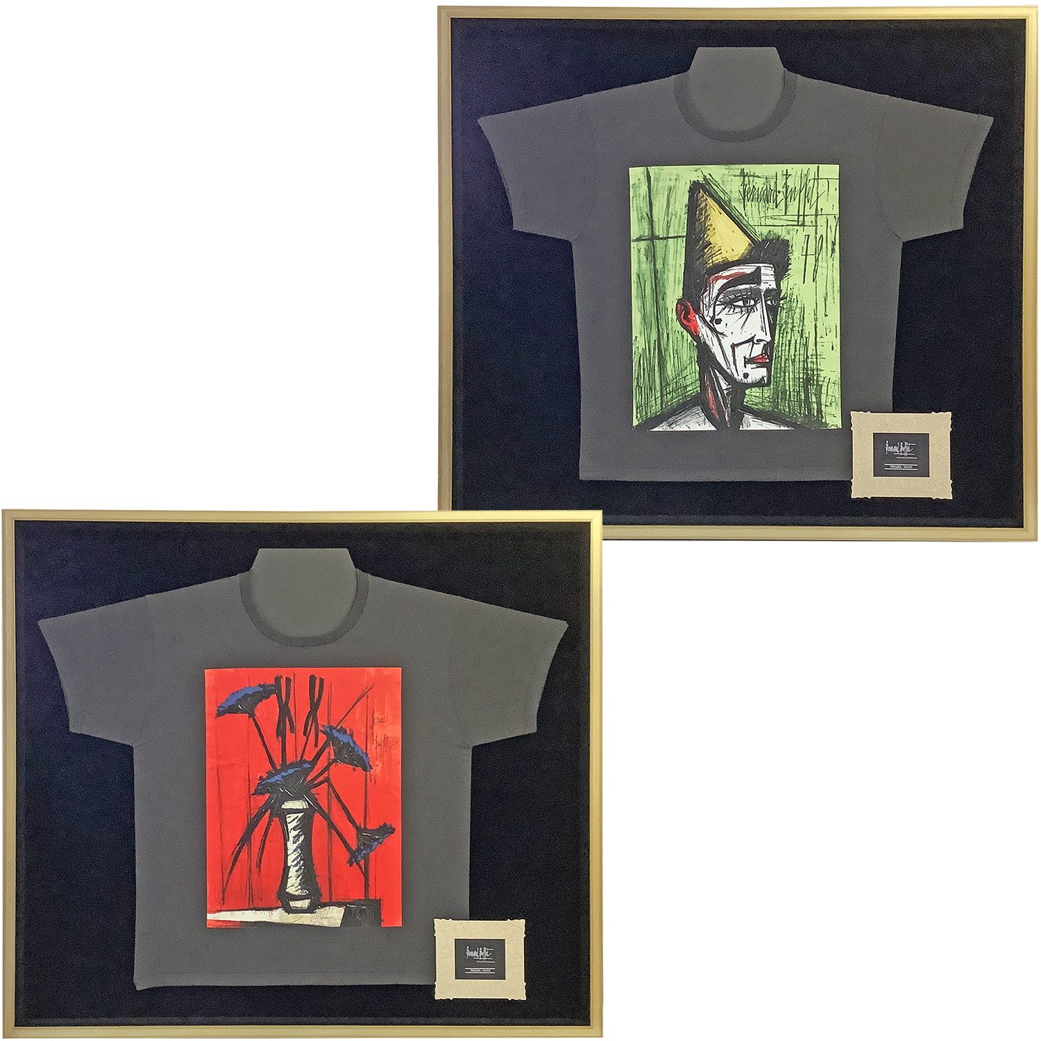 20世紀を代表する画家の一人であるフランスの画家ベルナール・ビュフェの作品をあしらったプリントTシャツを額装しました。通常、Tシャツ額装には布地を伸ばしながらシワを取る工程が必須となりますが、こちらのTシャツは立体的なペインティングがされており、力を掛け過ぎるとペインティング部分が割れてしまう可能性があります。その為通常よりも控えめな伸ばし具合となっていますが、実際シワはほとんど目立たない仕上がりとなりました。絶妙な力加減のなせる職人技の賜物です。