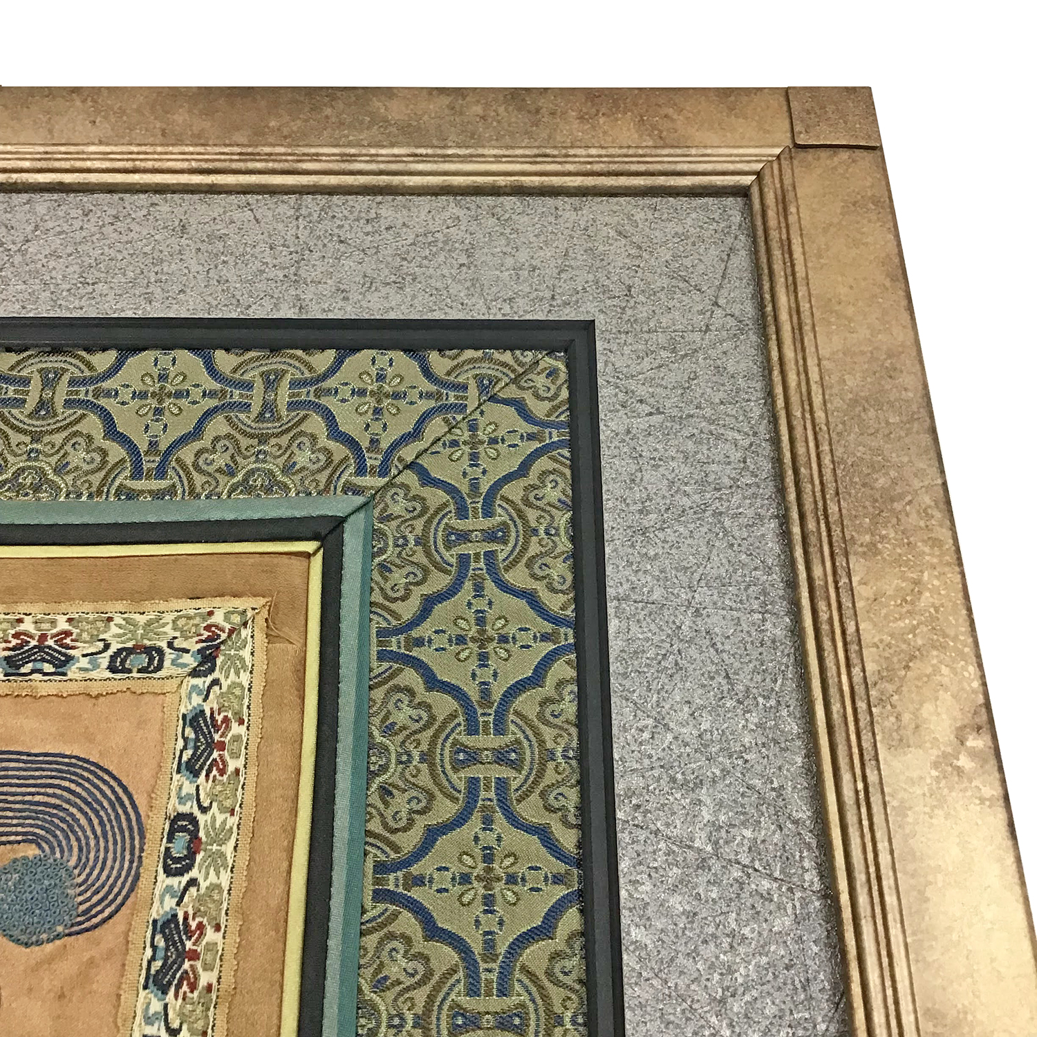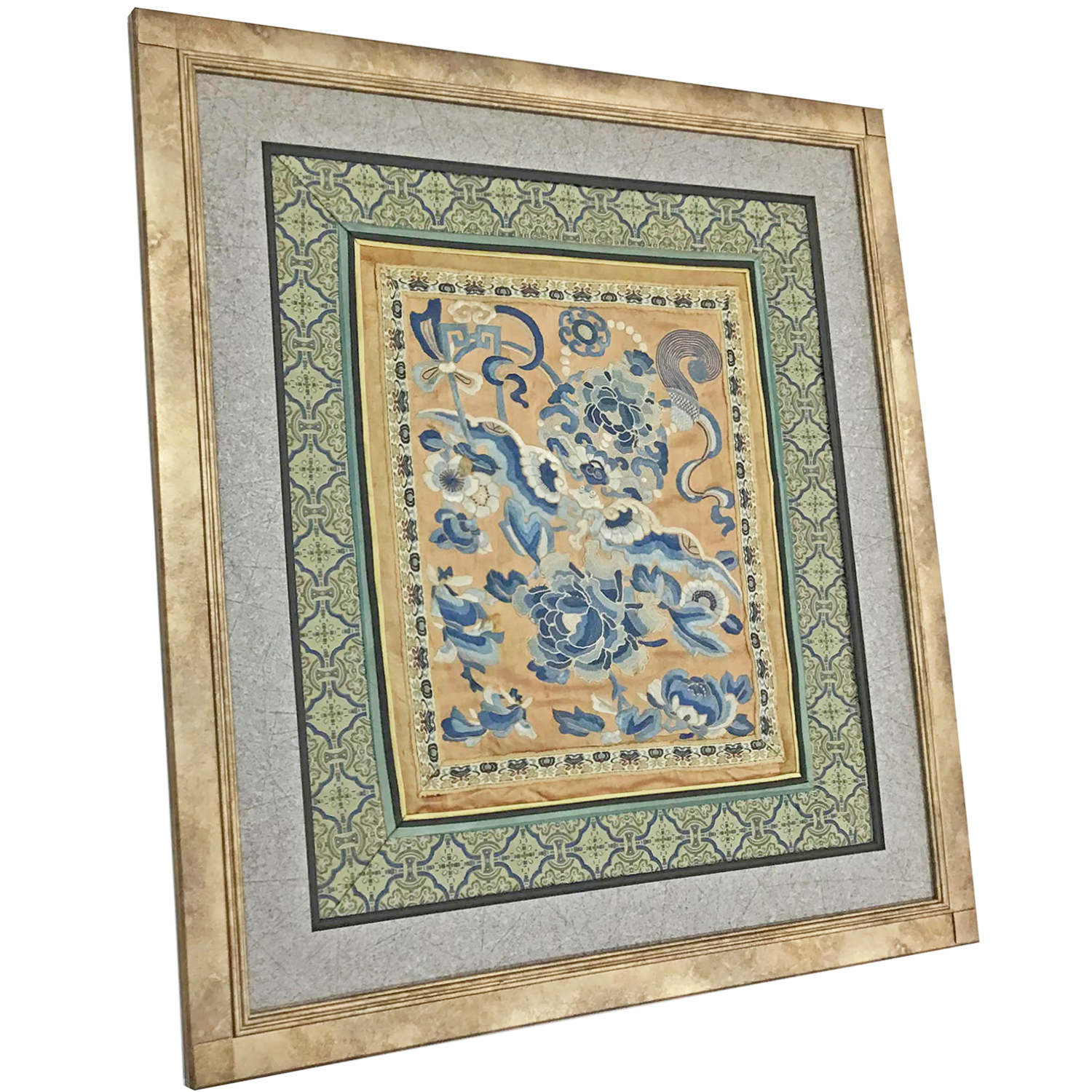 刺繍はおそらく絹糸なのか、向きによってつやつやとした輝きがわかります。フレームの表面もそれに近い控えめな光沢があり、相性が良い組み合わせです。大切に保存していたお品物の元の雰囲気を崩さずに、今後、飾った状態で末永く楽しめるような額装になりました。