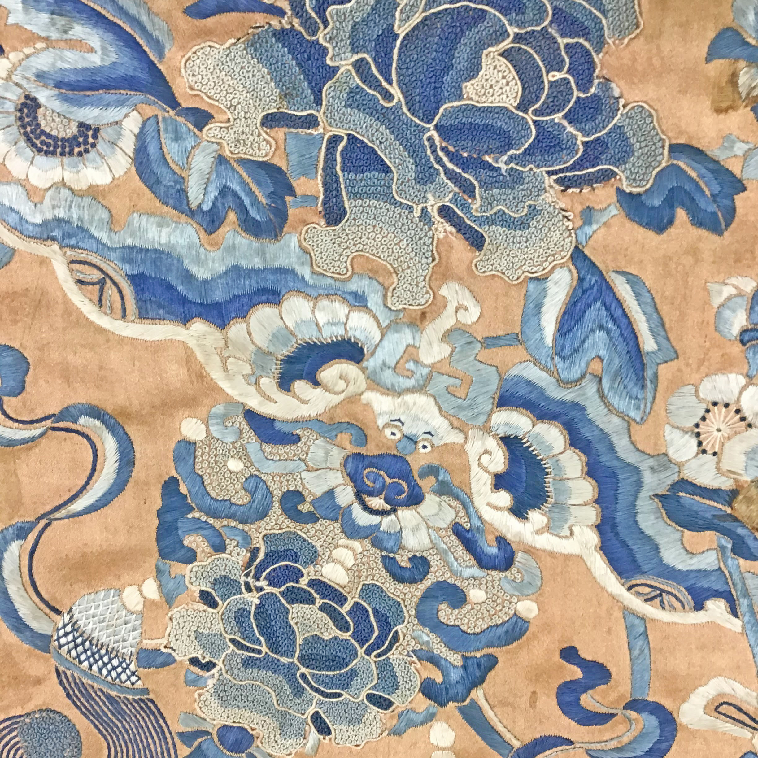 お客様のご家族が長年お持ちだったもので、ご自身が思っている以上に古いものかもしれないとのこと。太さが分からない位細い糸で、丁寧に縫い上げられ、厚ぼったさはなく、インテリアとしても実用向きのものでした。縁取りが太くなっており、その部分だけでも目立つように作られているため、置物などを上に置いて使用するものかもしれません。よく見ると、翼を持った生き物がいて、マットの中心あたりに小さな二つの目があり、どことなく愛嬌を感じる表情です。置物を置くより、単体で楽しみたいお品ですね。