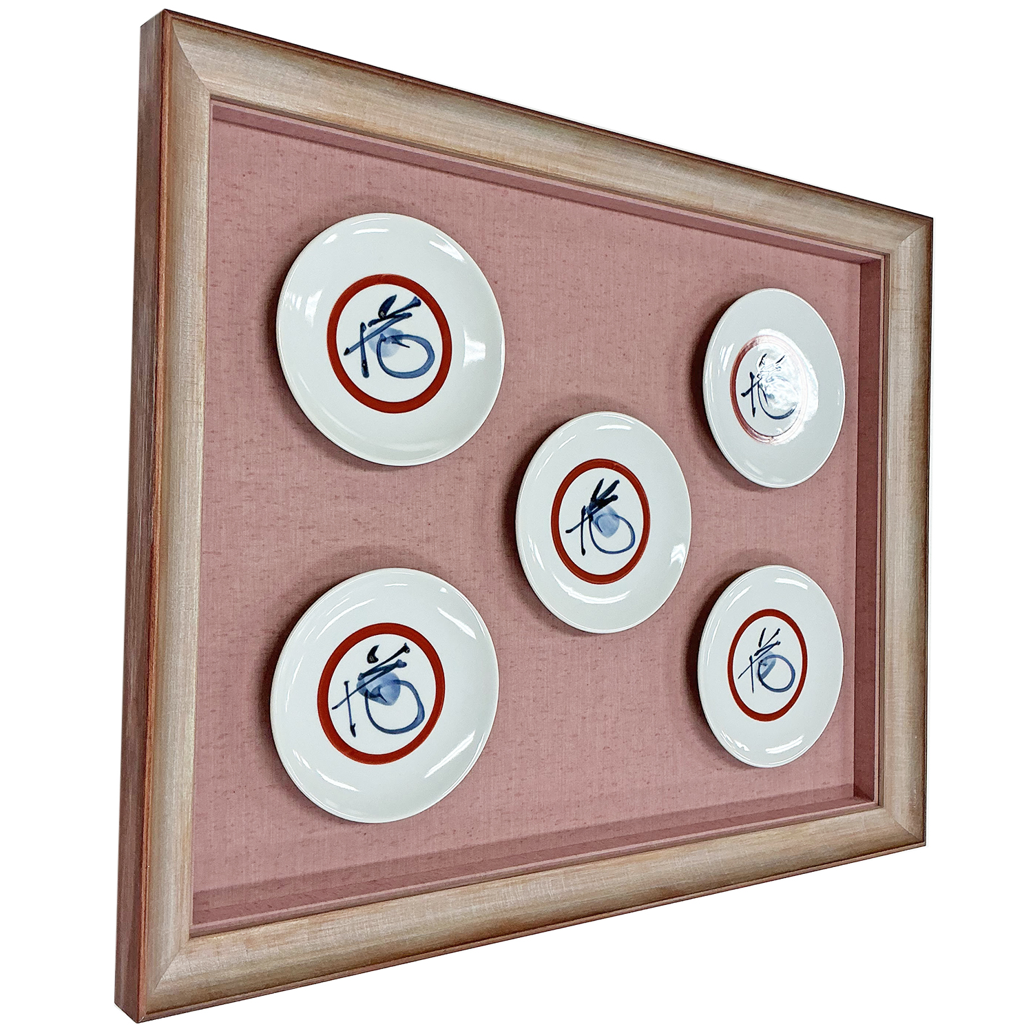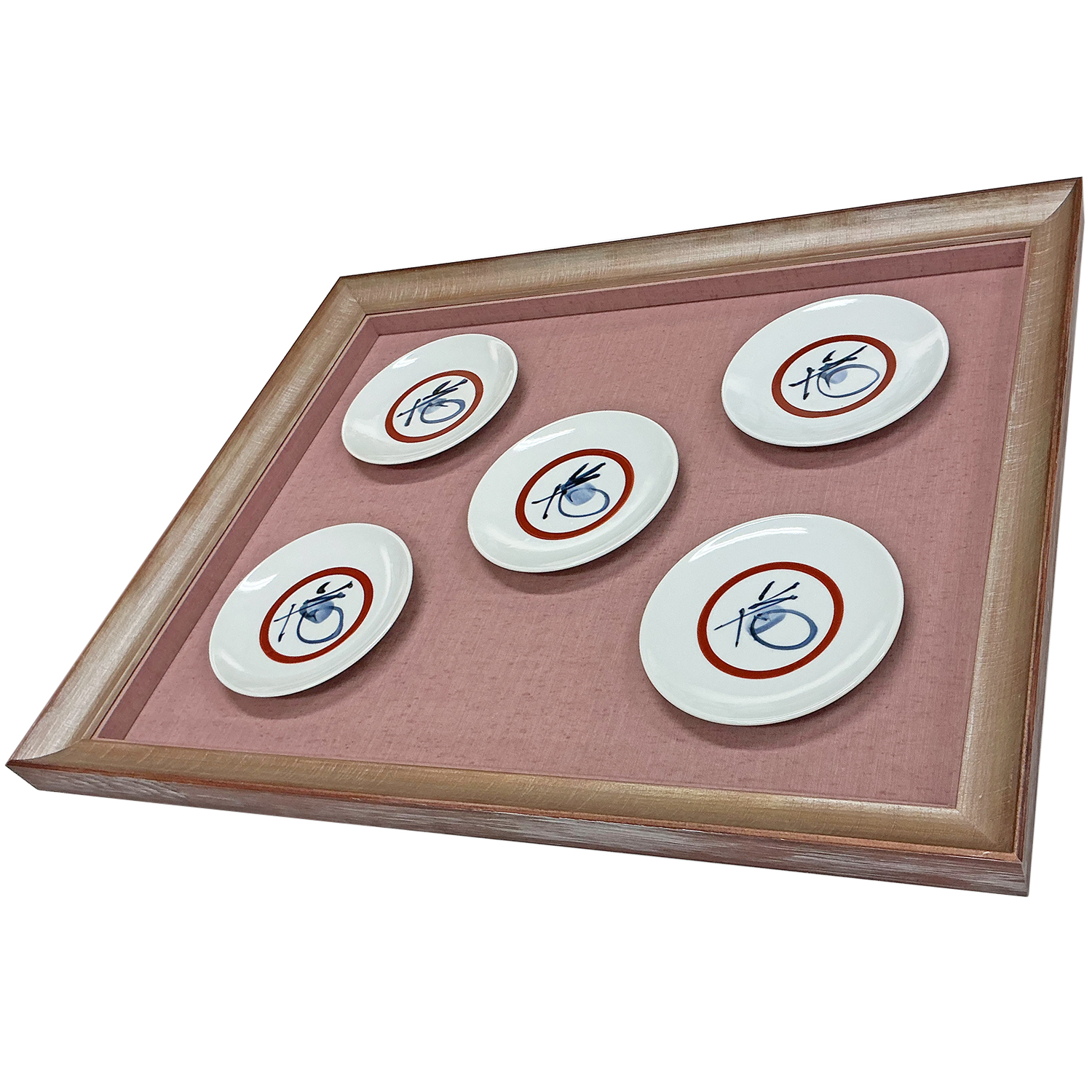 縁が平らで整っている軽量の皿のみに適した方法で、お皿の形状が適しているかどうかを慎重に見極めなくてはなりませんでしたが、作品のデザイン的な魅力がストレートに伝わる仕上がりになりました。複数のお皿が額の中に浮いているように見え、上質なインテリアとしての魅力が高まりました。