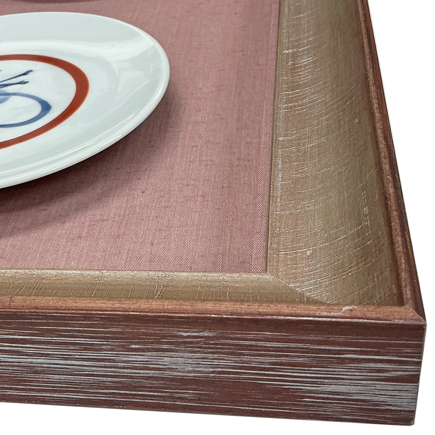 29-103紬風紅藤」を選びました。作品の配色に沿った色選びで、フレームの塗装の不思議な質感と、ざっくりとした紬風の布が、お皿の滑らかな美しさを引き立てています。お品物の持つ繊細な色彩と余白の表現をゆっくりと鑑賞できる額装に仕上がりました。