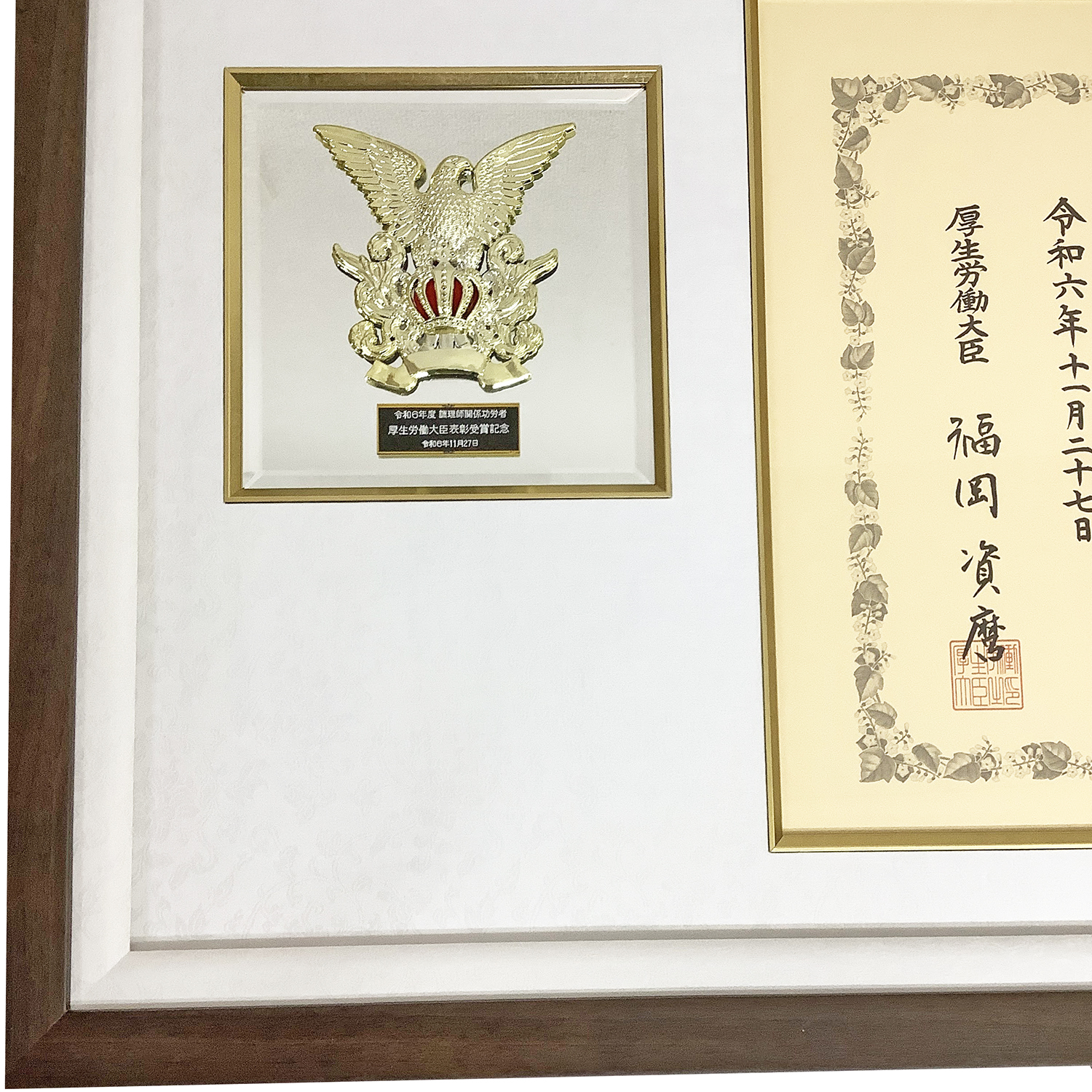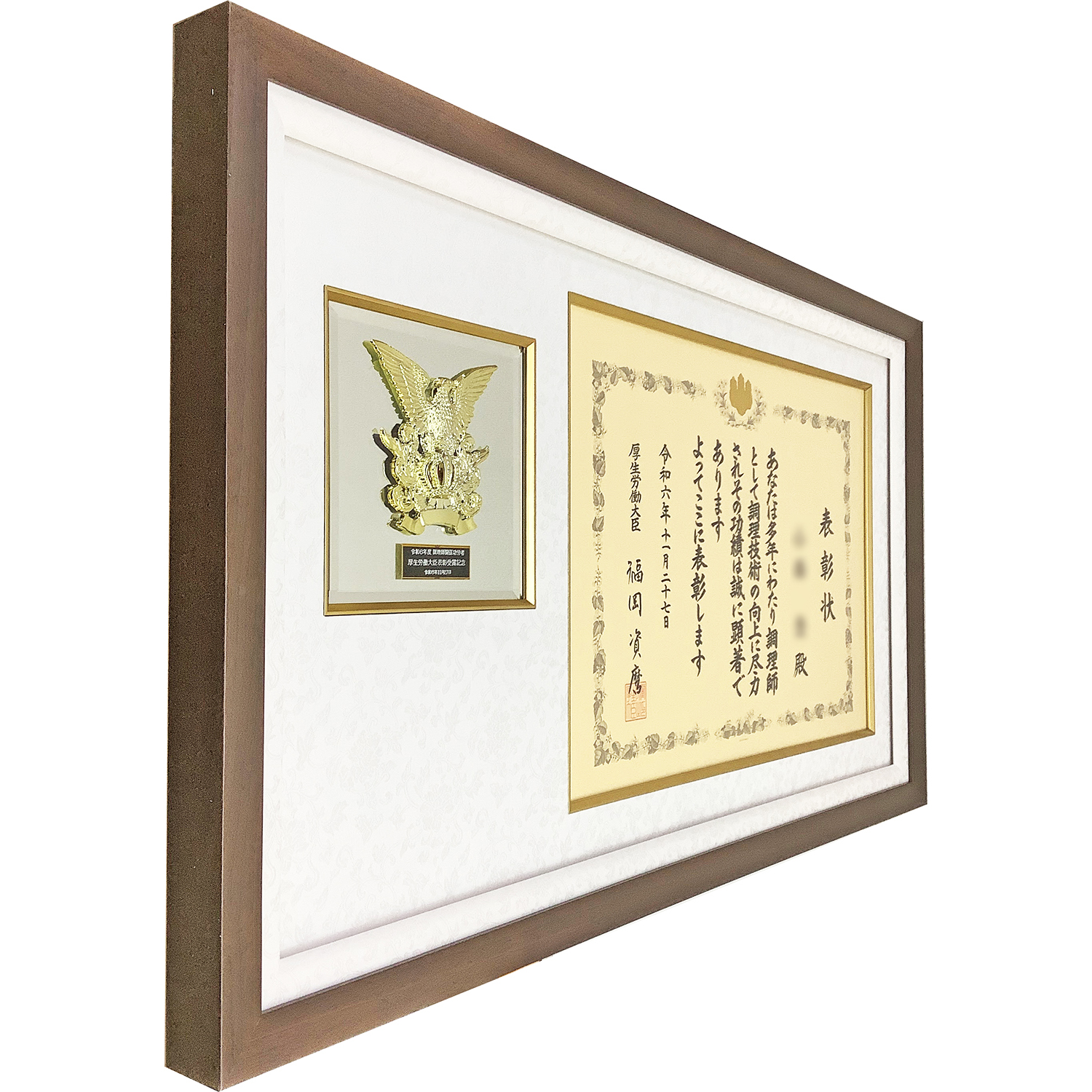 表彰状とエンブレムをそれぞれ独立したスペースに配置することで、品物同士が引き立つようにセットされています。ブラウンを基調としたフレームは品物の格式を損なわず、金色のエンブレムとの相性も良く、表彰状の落ち着いた紙色とも自然に調和します。全体として凛とした印象があり、贈呈品や記念品を丁寧に残したい方に適した額装です。大切な表彰状や記念品を長く美しく残すためにも額縁での保護と展示をおすすめします。