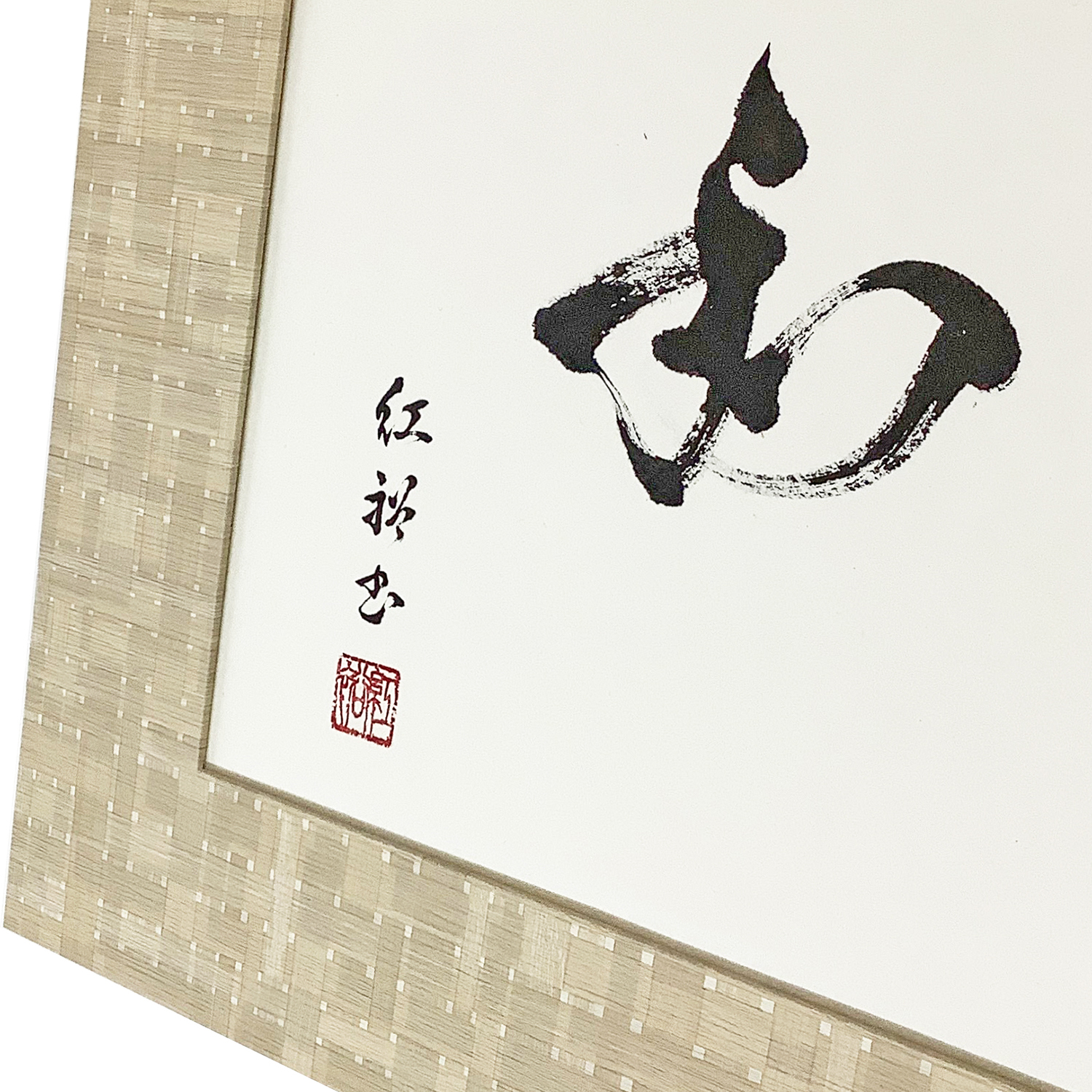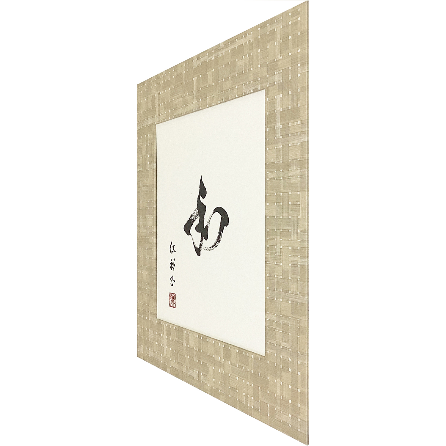 使用した額縁は、額縁のタカハシのオリジナル商品「モダンパネル」です。70ミリという贅沢な幅を持ちながら、角に継ぎ目がないフラットな形状が大きな特徴です。木製のベースにはざらざらとした質感のあるシート貼りを施した、現代的なインテリアにも馴染む高いデザイン性をもつ逸品です。モダンパネル自体の造形美を存分に活かすため、マットを付けずにシンプルに書を際立たせる額装としました。