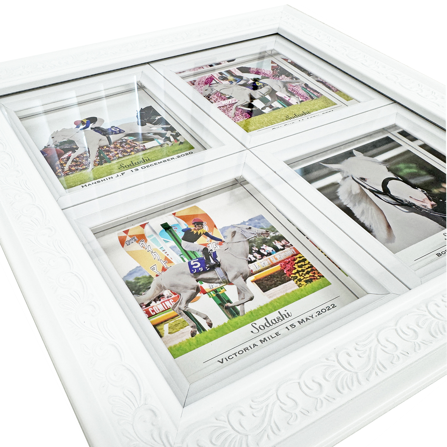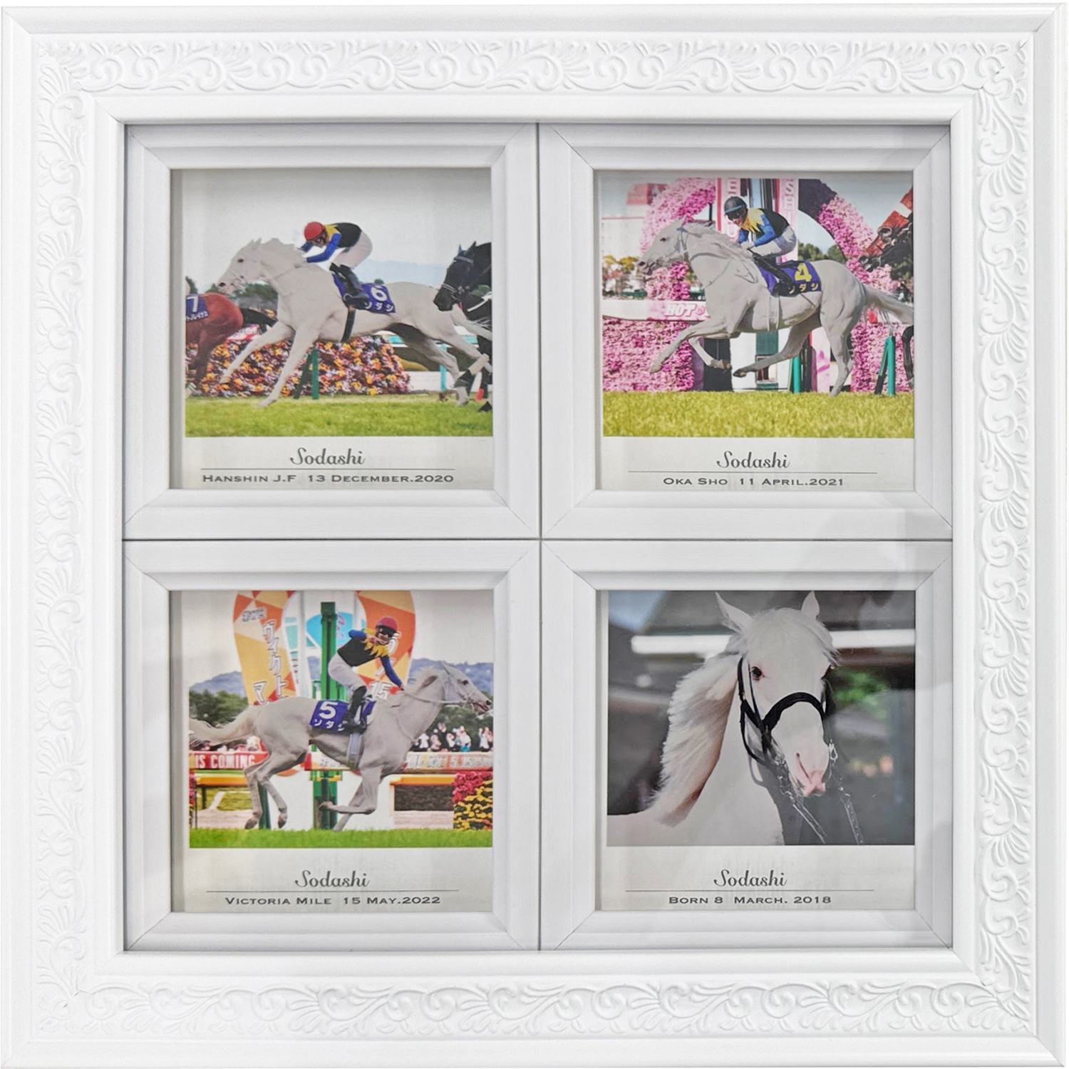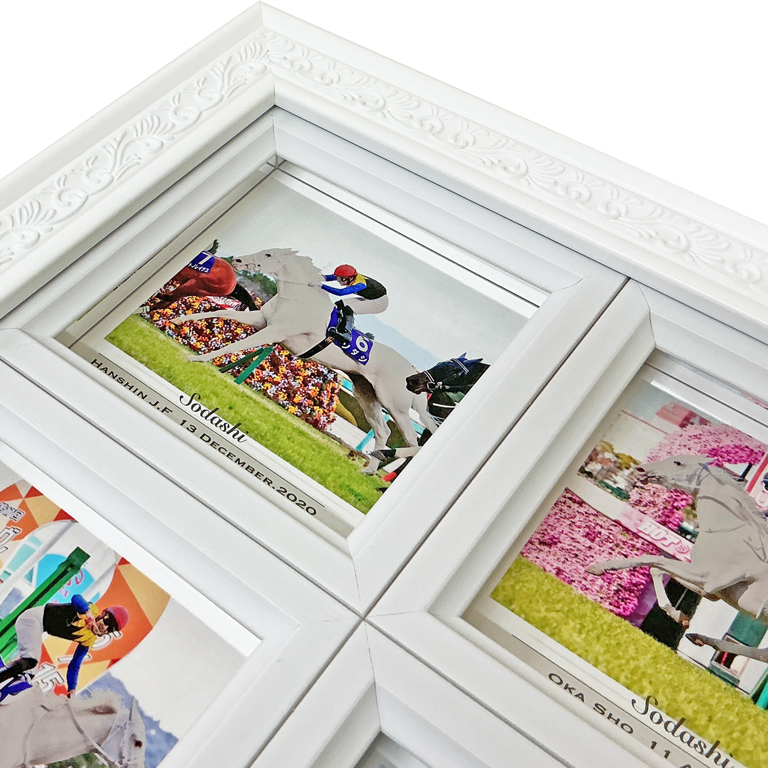 競馬史にその名を刻む「白毛の女王」ソダシ。阪神ジュベナイルフィリーズ、桜花賞、ヴィクトリアマイルといった輝かしい戦績を誇る名馬です。そんなソダシの雄姿が存分に楽しめる、4つのアクリルブロックを飾る額縁を製作しました。