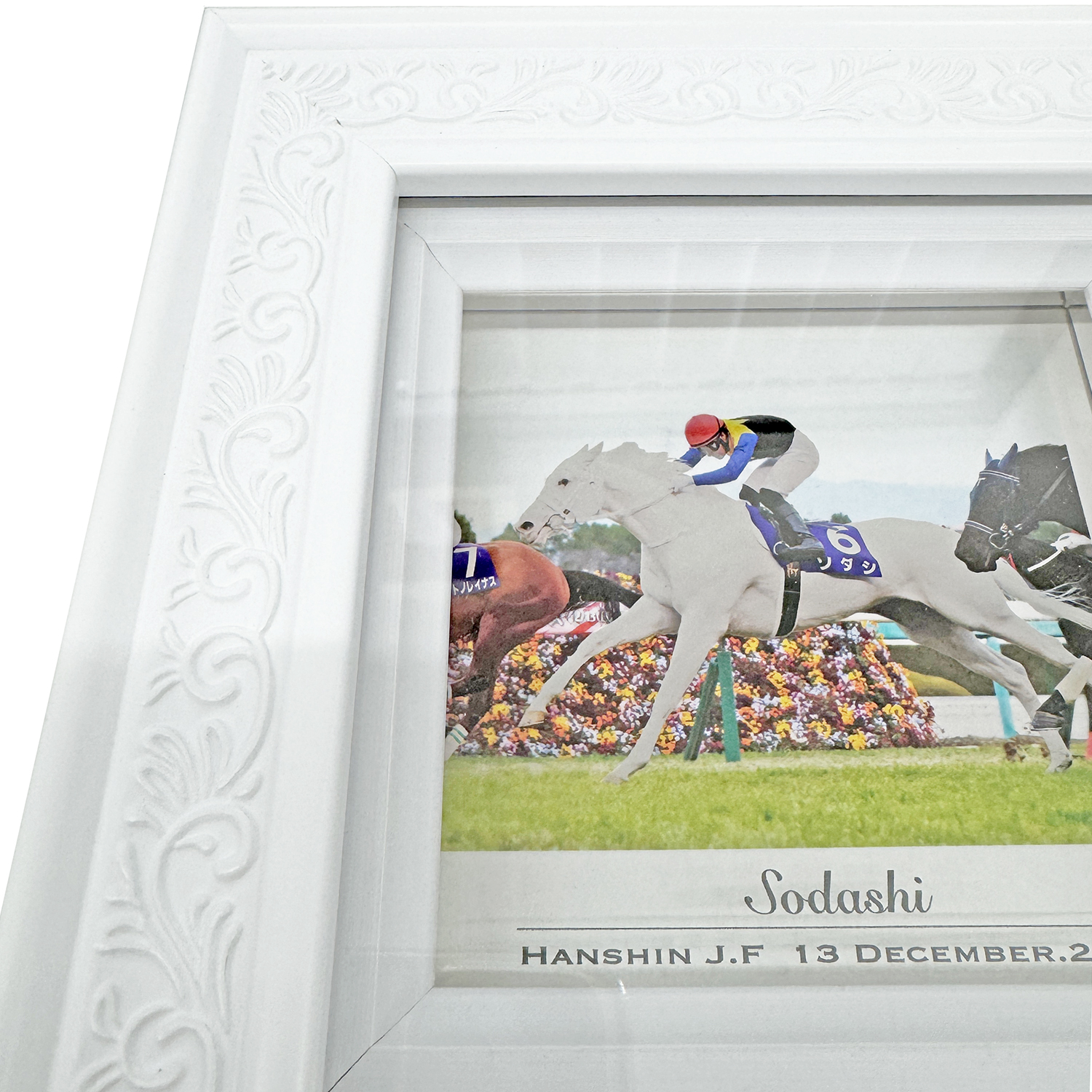 フレームには大柄な彫模様が施された樹脂製額縁「SF320ホワイト」を選択。適度な太さとボリューム、艶消しのホワイトが上品で落ち着いた印象を与えます。装飾性の高いデザインが、ソダシの気品溢れる姿と見事に調和しています。純白のフレームと彼女の白毛が重なり、より一層神々しさが引き立つ仕上がりとなっています。