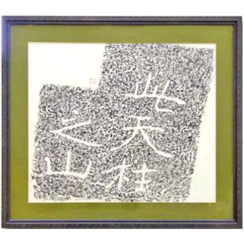 一般額タイプの典型スタイル、フレームと作品の間にマットを付けての額装です。既製サイズが利用できればその方がお安く仕上がります。貴重な拓本なので湿式裏打ちをし、特別に布貼りしたマットを使用して額装してあります。