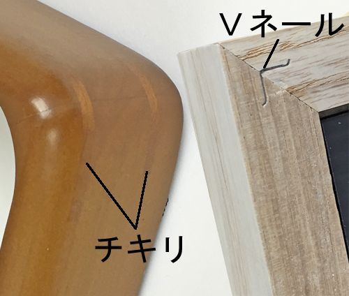 正確にカットされたフレーム断面にボンドを塗り、突き合わせた角にVネールという金具を打ち込みます。もしくは、ボンドで仮止めして組み上げた後、コーナーに溝を掘ってチキリを埋め込みをします。
