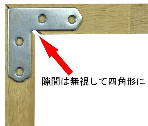 角を突き合わせても四角形にならない以上、きっちり角をくっつけて組み上げることはできません。コーナーにできる隙間は無視しつつ、およそで形を整えてながらL字金具で固定しましょう。