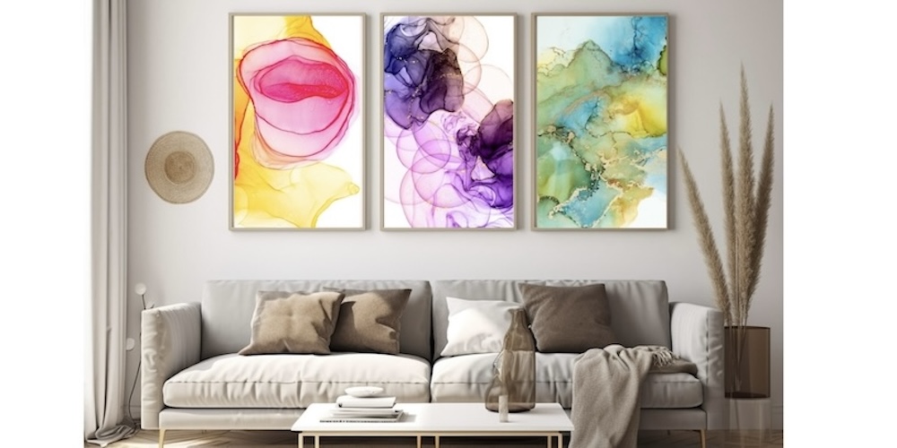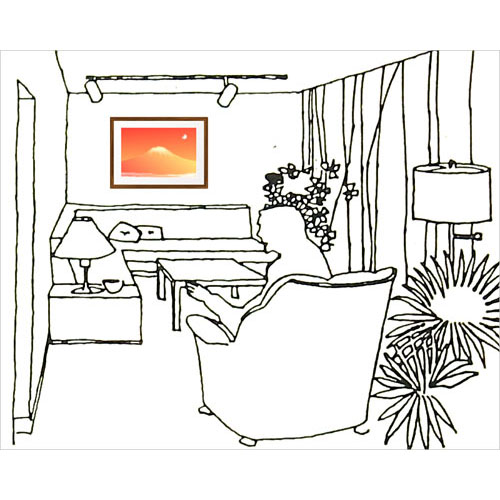 座ってくつろぐことが多いところでは、額縁の下部を110cm位にすると良いでしょう。額縁の大きさによっても変わるので、実際に飾った様子で微調整を行います。