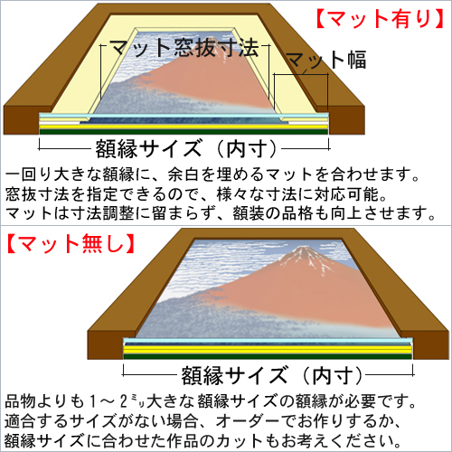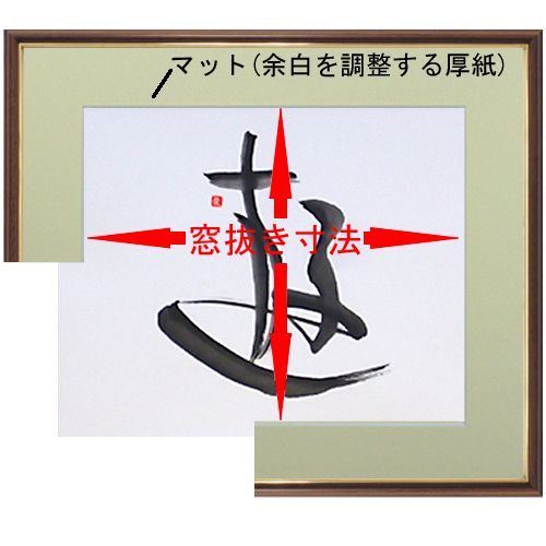 書道作品の場合、窓抜きしないマットを背景とし、作品を乗せる方法もありますが、見栄えや保存性に劣ります。なるべく窓抜きしたマットを使うようにしましょう。