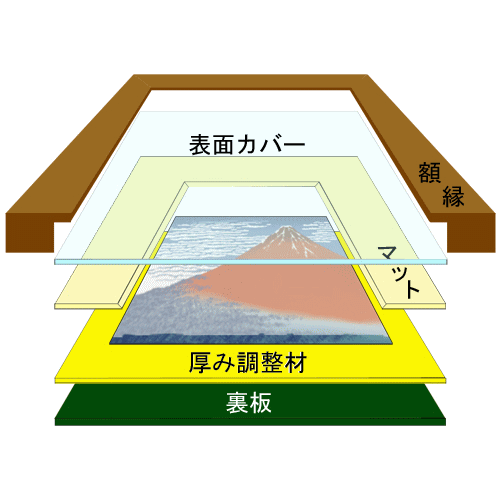 さらにマットの役割は見た目だけにとどまりません。マットの厚み分の空間で表面カバーと版画作品の密着を防ぎ、主成分となるセルロースの吸着効果で額縁内部の環境も整えます。