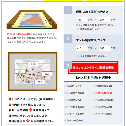 前述の[窓抜き寸法]を基準に、候補となる規格品の額縁サイズを検索することが可能です。