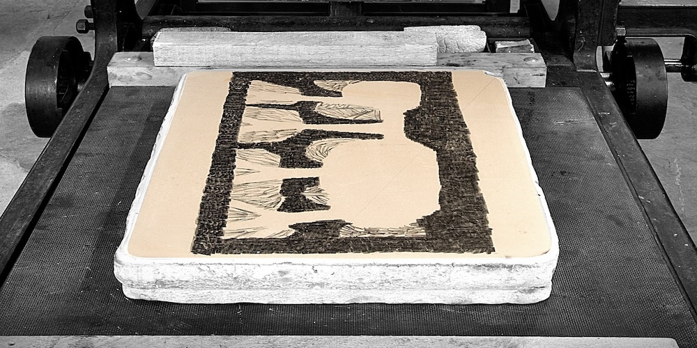 石版画。水と油の反発作用を利用した平版形式の版画です。もともとは天然の石灰石を版材にした版画でしたが、石材の入手困難と取り扱いの不自由さから、最近では亜鉛板やアルミ板などを使うのが一般的になっています。表面がギザギザの擦りガラスに油性クレヨンで絵を描いた状態を想像してください。この描画部分は水拭きしても反発して水は付きませんが、油性のものでしたらクレヨンになじんで付着します。この原理を利用したのがリトグラフです。