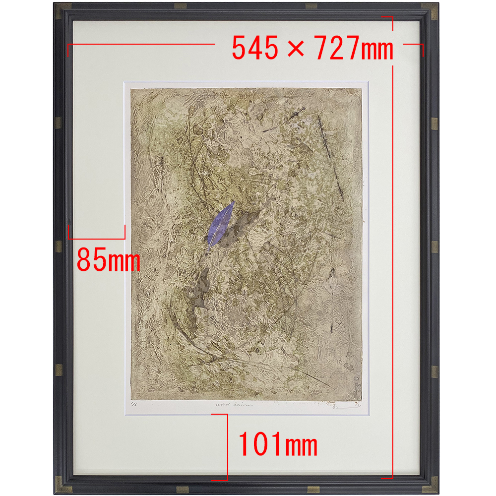 規格サイズの大全紙(545×727)を使った、落合皎児さんの銅版画[ウィンドミラー]の額装です。マット幅は左右が85ミリ、天地が101ミリ。マット幅は異なりますが、見た目に違和感はありません。むしろ、長手方向のマット幅が若干広いことで、安定感が感じられます。
