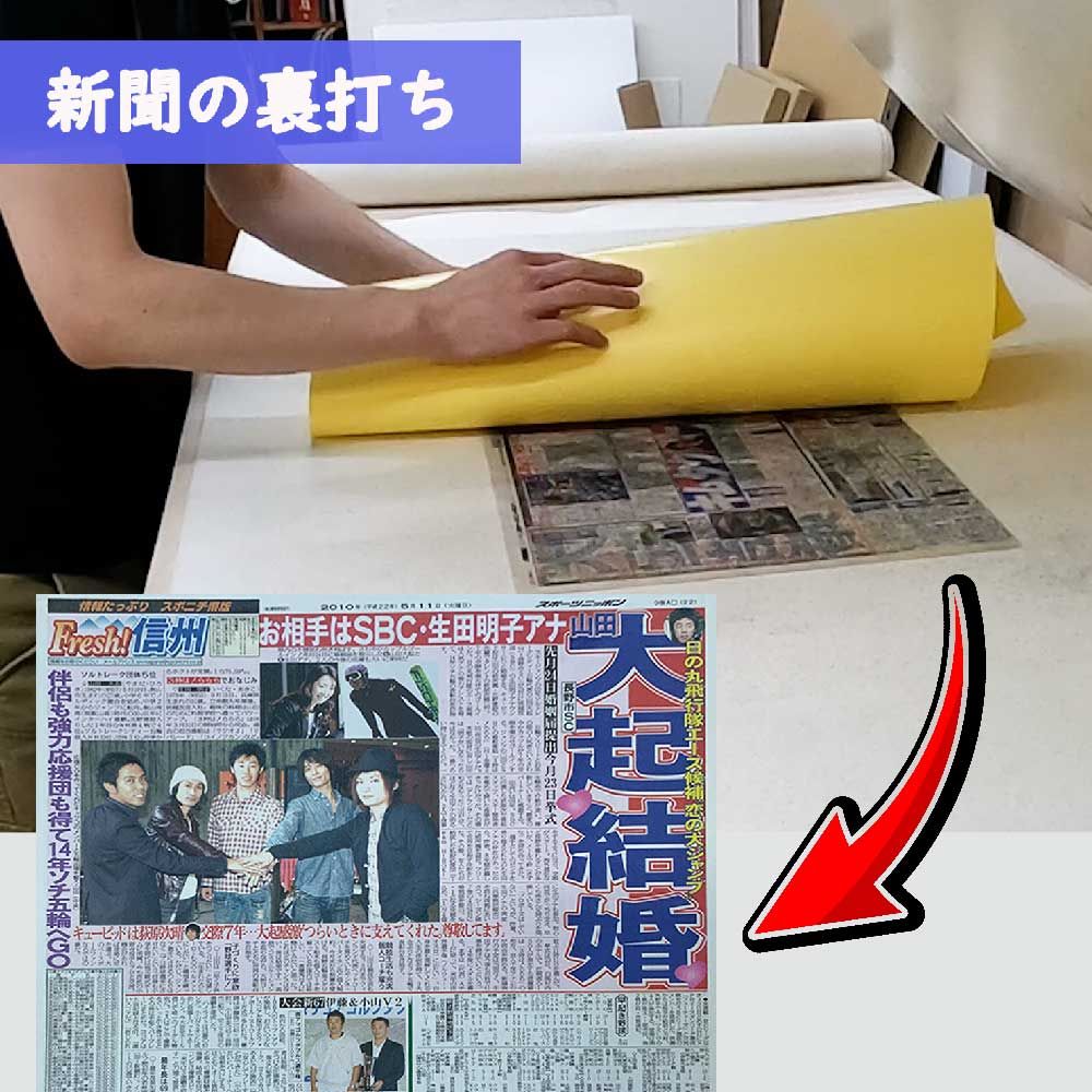 1つ目は、新聞を裏打ちすること。裏打ちという言葉、あまりなじみがない方も多いと思います。半紙に墨で字を書くとしばらくすると紙がパリパリになります。
