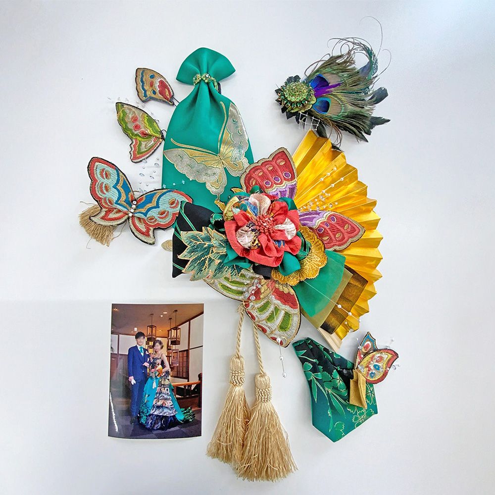 一生に一度の晴れ舞台。この日のために手作りで製作されたとのこと。ブローチはなんとリスナー様であるお母さまが新婚旅行で購入されたお品。また、新婦様のドレスは着物市で見つけた振袖をリメイクしたものだそうです。新郎様のネクタイも同じ生地が使われており、お二人のこだわりが伝わってきます。