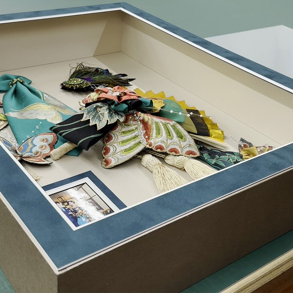 額装のポイントの2つ目は、厚みのあるものが入る額にすること。平面のものならば薄いフレームで対応できますが今回のように品物自体に厚みがある場合は注意が必要です。額の中は深さのあるBOX仕様の形状にします。