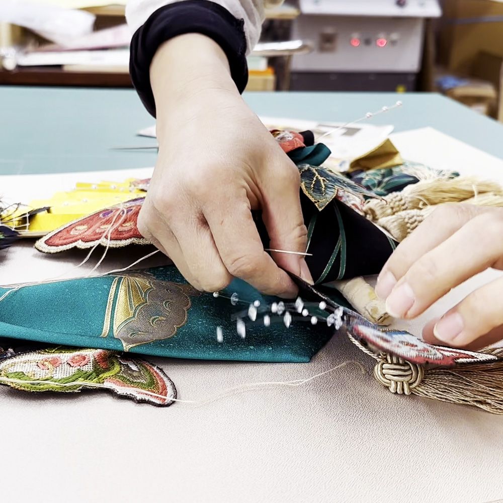 ずれないように固定していくことは額装の工程には必須。土台の板にしっかり縫い付けていきます。糸の処理やBOX部分の布貼りなど細かな作業を経て一つの額装が仕上がっていきます。