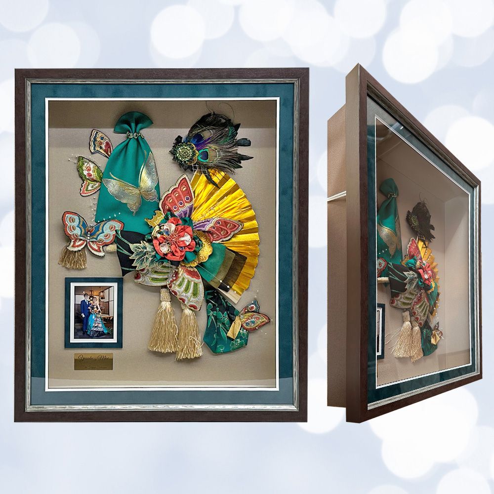 最近はこのように立体的なものを額装される方が非常に増えています。車のハンドルや扇子、造花、釣りのルアーなど多岐にわたります。額装実例集にさまざまな額装がでていますのでご覧ください。
