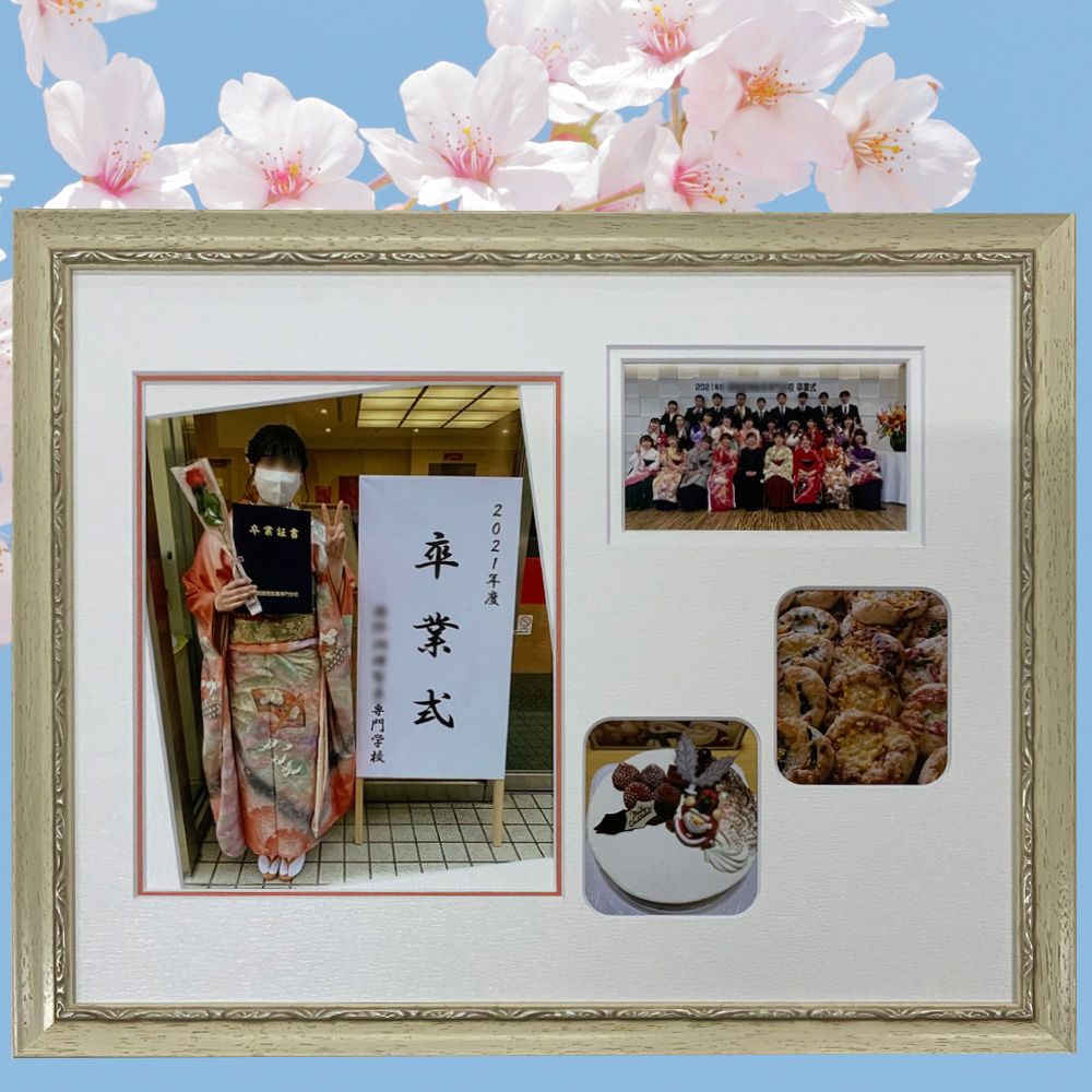 コロナの影響でご両親は同席することが叶わなかった卒業式。それでも同じ夢に向かう仲間と共にすがすがしい表情で写っているお顔が印象的です。卒業式と関連のお写真を一つの額縁に収めていきます。